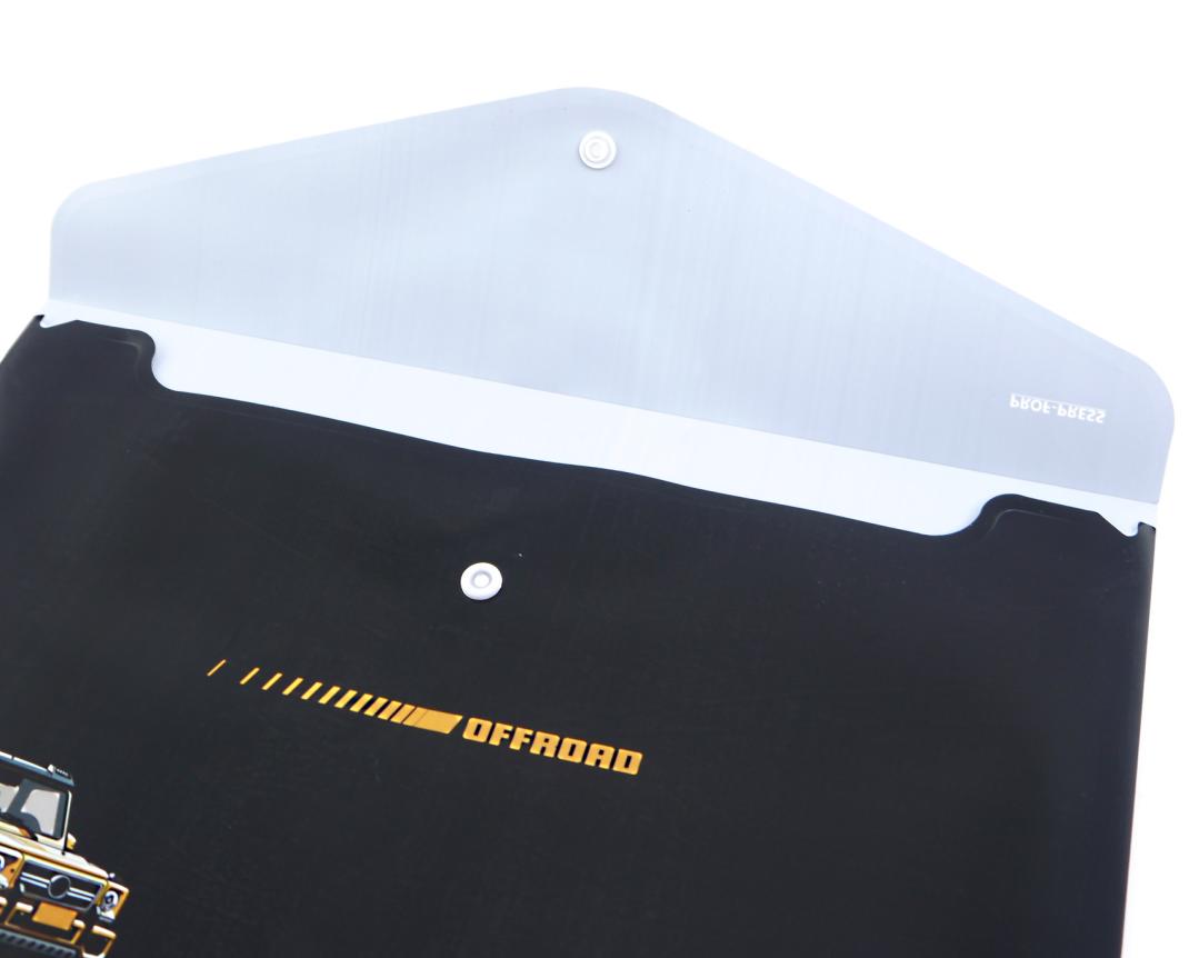 | Папка на кнопке А4 ИДП 180мкм Внедорожник  Папка-конверт формата А4 и толщиной 180 мкм изготовлена из пластика, который защищает изделие от сминания и других повреждений. Плотно закрывается на кнопку, которая рассчитана на ежедневное использование. Изделие имеет горизонтальную ориентацию. |