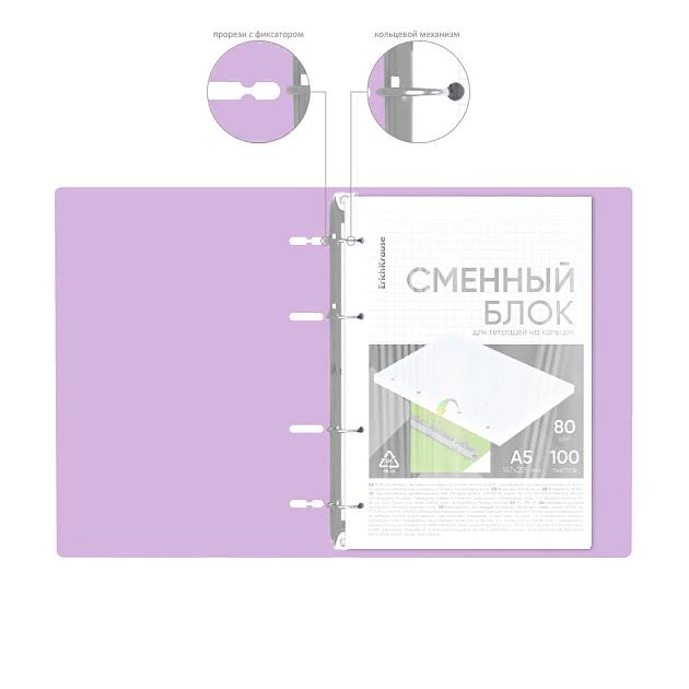 | | Тетрадь на кольцах А5 со сменным блоком 100 листов (клетка) ErichKrause (пластиковая обложка) IQ FineLine BraveCats фиолет Ассорти  Тетрадь общая формата А5 (147x205 мм). Обложка из высококачественного износостойкого матового пластика с фактурой «песок». В блоке 100 листов в клетку в рамке. Бумага офсетная плотностью 80 г/м2. Цвет линовки — синий. Скругленные уголки обложки. Тип скрепления — кольца. Прорези под кольца оснащены фиксаторами, которые предотвращают раскрытие тетради. Товар представлен в ассортименте без возможности выбора цвета/дизайна. |