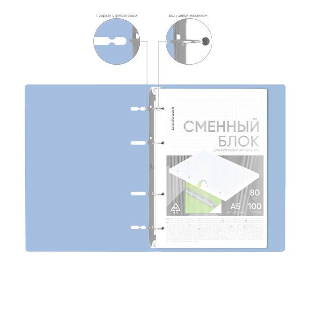 | Тетрадь на кольцах А5 со сменным блоком 100 листов (клетка) ErichKrause (пластиковая обложка) IQ FineLine Symbol голуб Ассорти  Тетрадь общая формата А5 (147x205 мм). Обложка из высококачественного износостойкого матового пластика с фактурой «песок». В блоке 100 листов в клетку в рамке. Бумага офсетная плотностью 80 г/м2. Цвет линовки — синий. Скругленные уголки обложки. Тип скрепления — кольца. Прорези под кольца оснащены фиксаторами, которые предотвращают раскрытие тетради. Товар представлен в ассортименте без возможности выбора цвета/дизайна. |