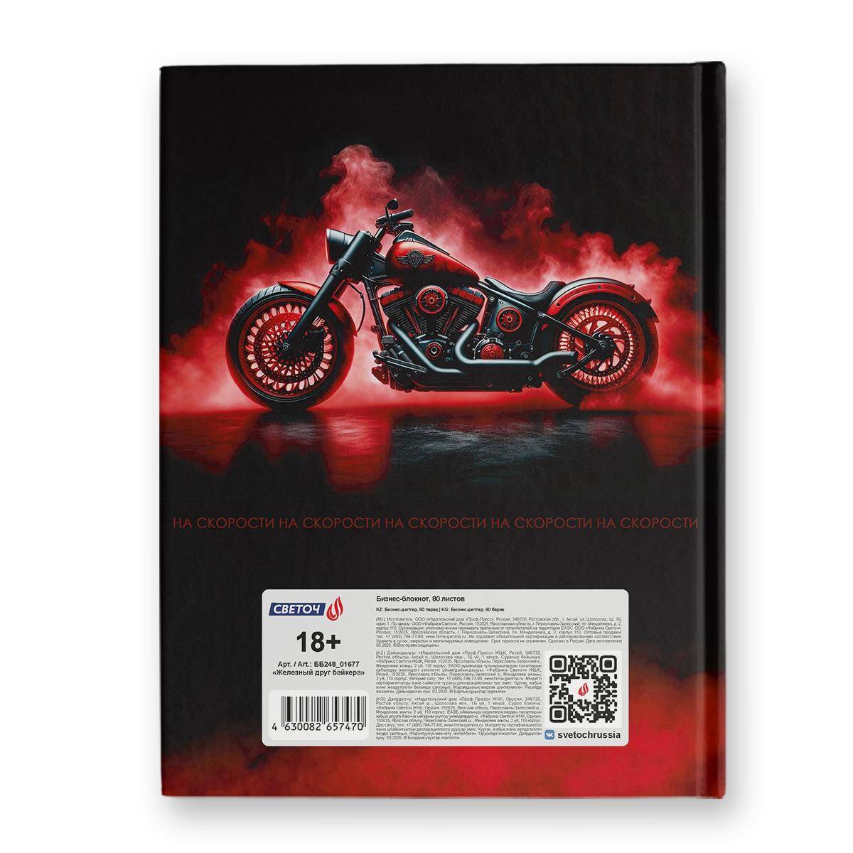 | Тетрадь (твёрдая обложка) А5 80 листов (клетка) SVETOCH (матовая ламинация) Железный друг байкера  Тетрадь в твердой обложке А5 формата, 80 листов - прекрасный помощник в учёбе и работе. Внутренний блок изготовлен из качественной офсетной бумаги плотностью 60 г/кв. м, 100% белизны, обложка - твердый картон. Линовка - клетка. Дизайн изделия дополнен спецэффектом в виде глянцевой ламинации. Бизнес-блокноты упакованы в термоусадочную пленку по 4 штуки. В коробе находится 6 упаковок, 24 шт. |