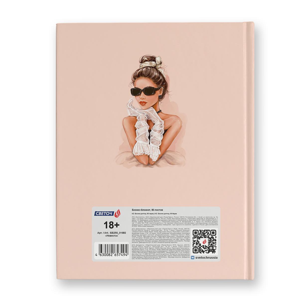 | | Тетрадь (твёрдая обложка) А5 80 листов (клетка) SVETOCH (матовая ламинация) (выборочный лак) Невеста  Тетрадь в твердой обложке А5 формата, 80 листов - прекрасный помощник в учёбе и работе. Внутренний блок изготовлен из качественной офсетной бумаги плотностью 60 г/кв. м, 100% белизны, обложка - твердый картон. Линовка - клетка. Дизайн изделия дополнен спецэффектом в виде глянцевой ламинации. Бизнес-блокноты упакованы в термоусадочную пленку по 4 штуки. В коробе находится 6 упаковок, 24 шт. |