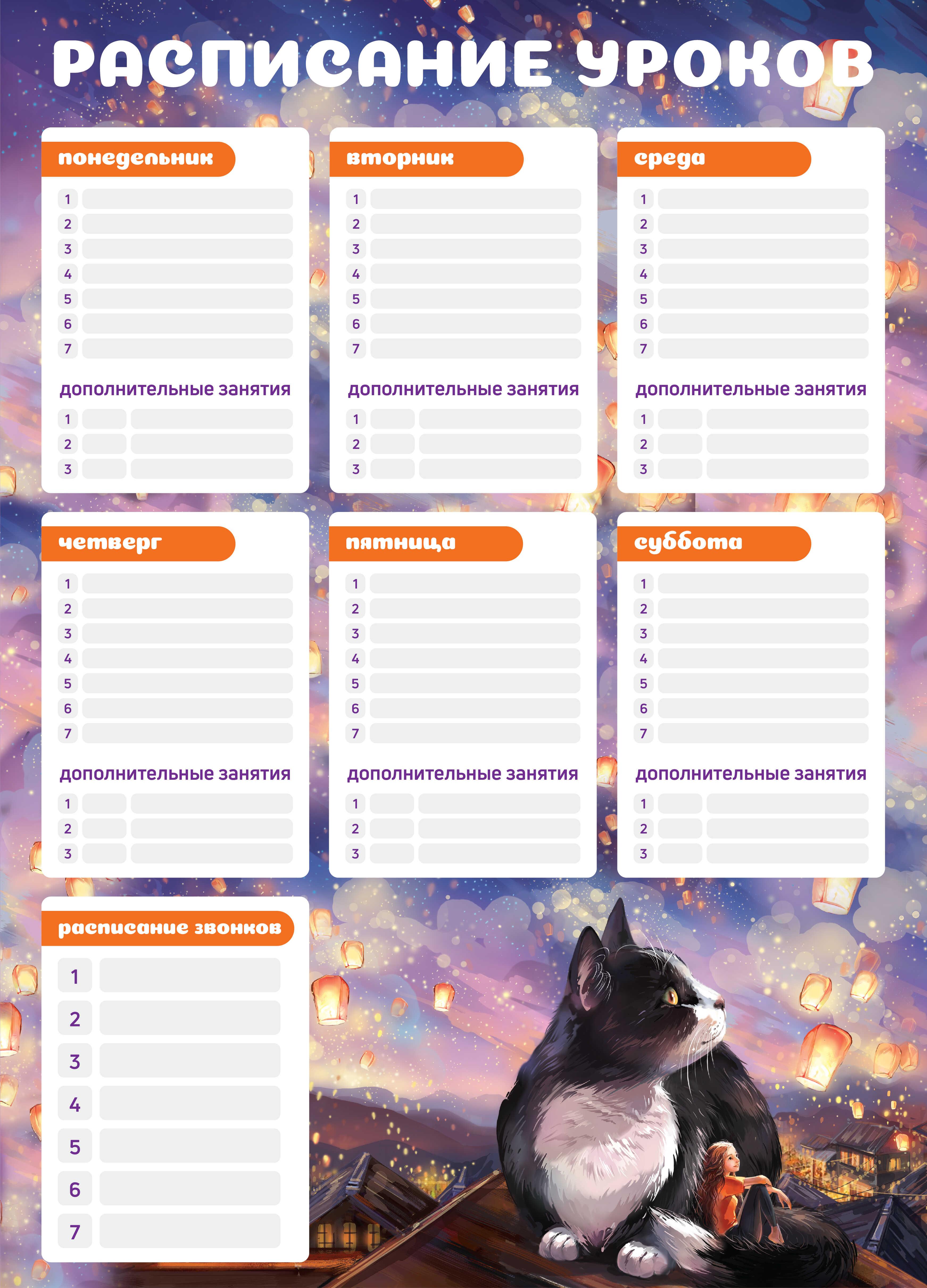 Расписание уроков и занятий А4 (Открытая Планета) 85 641 Аниме  Расписание уроков необходимо каждому ученику! Это незаменимый помощник ребенка в учебном процессе, который приучает младших школьников к организованности, аккуратности и последовательности действий. План уроков, время звонков и даже пометки о дополнительных занятиях после уроков - всегда перед глазами. С помощью расписания школьник не забудет сделать домашнее задание и правильно соберет необходимые книги и тетради. |