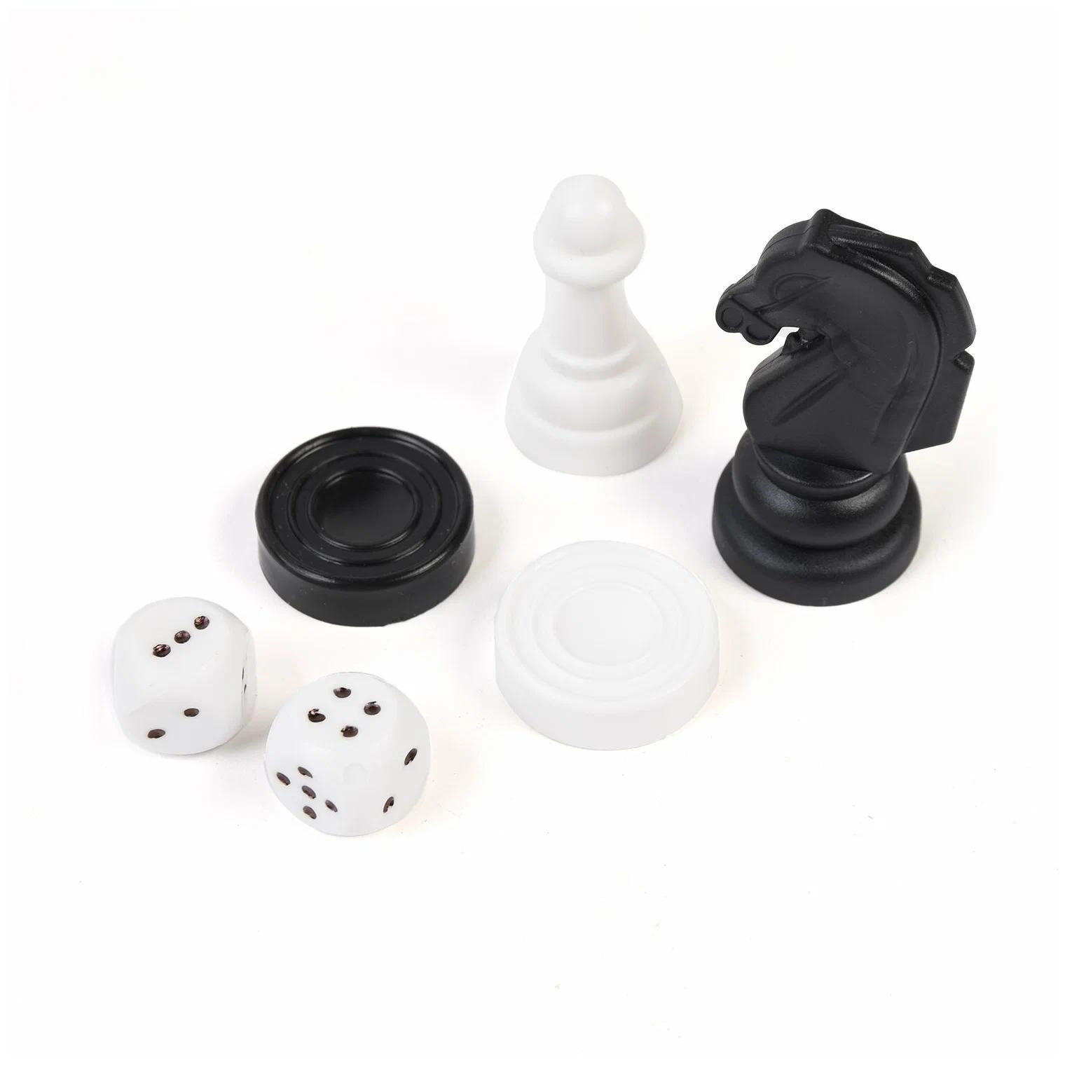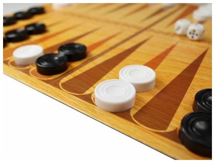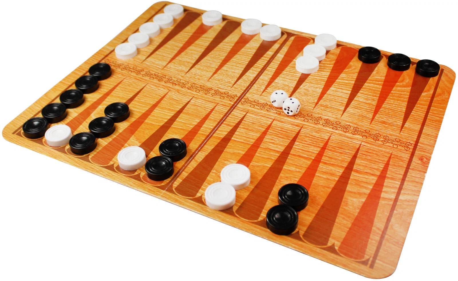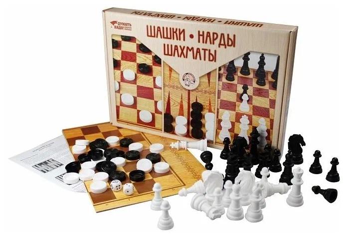 | | Игра настольная Шахматы+шашки+нарды 3 в 1 ДК 34*34см (картонная упаковка)   О товаре Шашки, нарды, шахматы 3в1 – это набор красиво оформленных классических настольных игр для вашего ребенка. Набор состоит из двухстороннего игрового поля: одна сторона поля предназначена для игры в шахматы и шашки, вторая – для игры в нарды. Края у игрового поля скруглены, и оно легко складывается пополам. Благодаря небольшому размеру и весу набора, его можно брать с собой, отправляясь в путешествие. Помимо классических шахмат, игровое поле также позволяет играть в самые различные варианты шашек: бразильские шашки, поддавки, чекерс, русские шашки, пул, итальянские шашки. Описание правил к данным видам игр читайте на обратной стороне коробки. Правила игры в нарды находятся внутри коробки. Набор 3в1 «Шашки, нарды, шахматы» скрасит досуг вашего ребенка весельем и удовольствием, а также будет способствовать развитию образного мышления, комбинаторики, памяти, внимательности, логического мышления и способности мысленно просчитывать свои шаги на много ходов вперёд. Состав игры: - двухстороннее игровое поле из картона – 1 шт. (42 х 32,5 см)