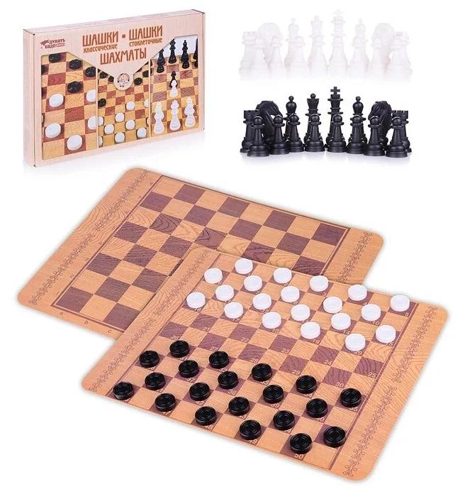 | Игра настольная Шахматы+шашки 2 в 1 ДК 34*34см (картонная упаковка) 03873   «Шашки классические, шашки стоклеточные, шахматы» от «Десятого королевства» – это набор классических настольных игр для вашего ребёнка, позволяющий играть во все варианты шашек (включая международные или стоклеточные шашки) и шахматы. Состав игры: - двухстороннее игровое поле из картона – 1 шт. (42 х 32,5 см)