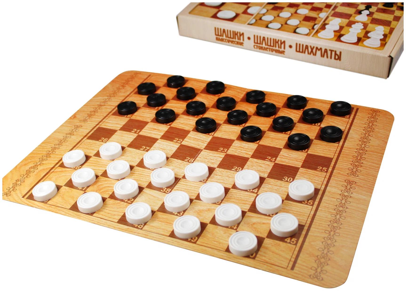 Цвет шашек и шахматных фигур может отличаться от изображённого на упаковке. Набор состоит из двухстороннего игрового поля из плотного картона: одна сторона поля предназначена для игры в шахматы и шашки, вторая – для игры в стоклеточные (международные) шашки. Края у игрового поля скруглены, и оно легко складывается пополам. Благодаря небольшому весу набора, его удобно брать с собой, отправляясь в путешествие. Помимо классических шахмат, игровое поле также позволяет играть в самые различные варианты шашек: русские, итальянские, бразильские шашки, поддавки, чекерс, пул, а также в международные шашки (стоклеточные). Описание правил к данным видам игр читайте на обратной стороне коробки. Набор «Шашки классические, шашки стоклеточные, шахматы» способствует развитию образного мышления, памяти, внимательности, комбинаторики, логического мышления и способности мысленно просчитывать свои шаги на много ходов вперёд, а также скрасит досуг вашего ребёнка весельем и удовольствием.  |