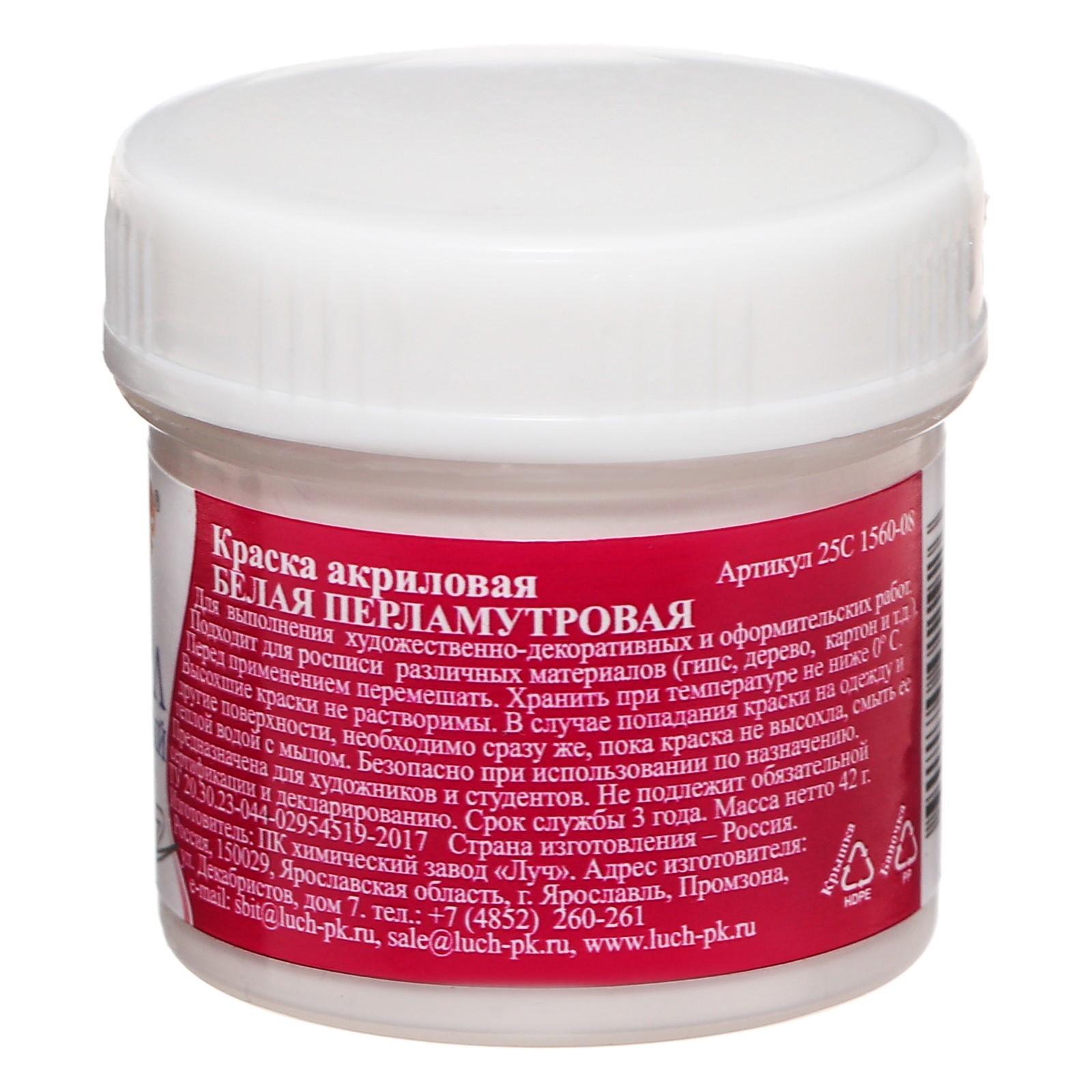 | | Краска акриловая ЛУЧ 40 мл перламутровая белая  Глянцевые акриловые краски предназначены для художественных, декоративных и дизайнерских работ. Акриловые краски, как и акварельные, легко разбавляются водой, но после высыхания их уже нельзя размочить, образуют несмываемую плёнку. Красочный слой эластичен, прочен и долговечен. Красками можно работать практически на любой поверхности (бумага, картон, грунтованный холст, дерево, металл, кожа и других). - Красивые классические цвета;
