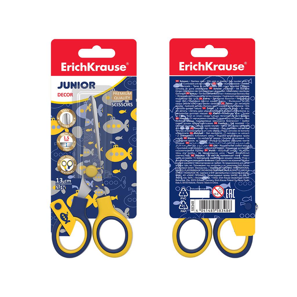 | Ножницы детские 130мм ErichKrause Junior Decor Submarine (картонная упаковка с европодвесом)  Ножницы с принтом на лезвиях из высококачественной нержавеющей стали с безопасными закругленными концами. Ручки классической формы с противоскользящими резиновыми вставками изготовлены из ударопрочного пластика. |