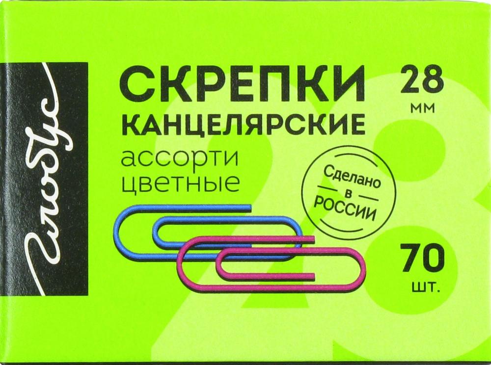 | Скрепка канцелярская цветная 28мм 70шт ГЛОБУС (картонная упаковка)  Скрепки металлические, гладкие, с полимерным покрытием, цветные. Длина — 28 мм, толщина — 1 мм. В картонной упаковке 70 шт. |