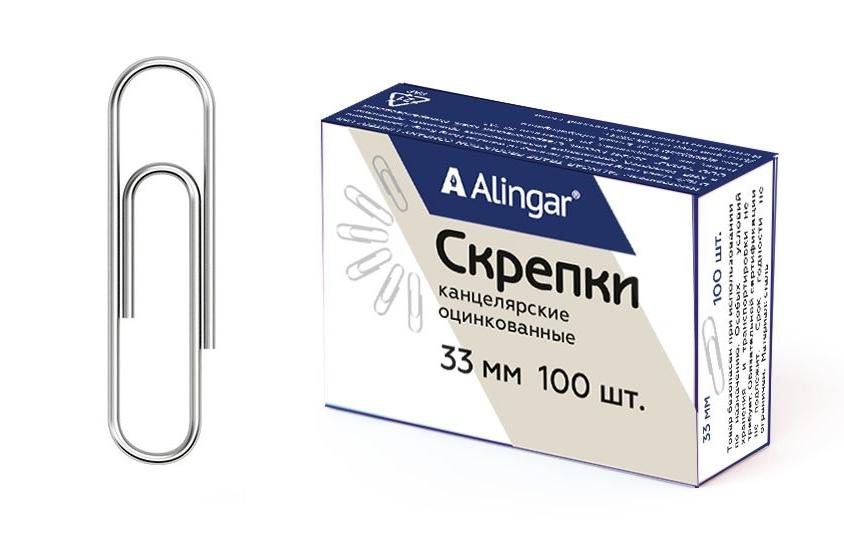| | Скрепка канцелярская 33мм 100шт ALINGAR оцинкованные (картонная упаковка)