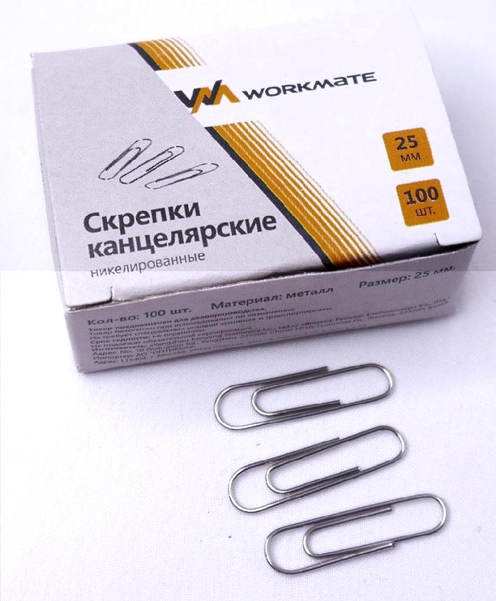 | Скрепка канцелярская 25мм 100шт WORKMATE никелированные (картонная упаковка)