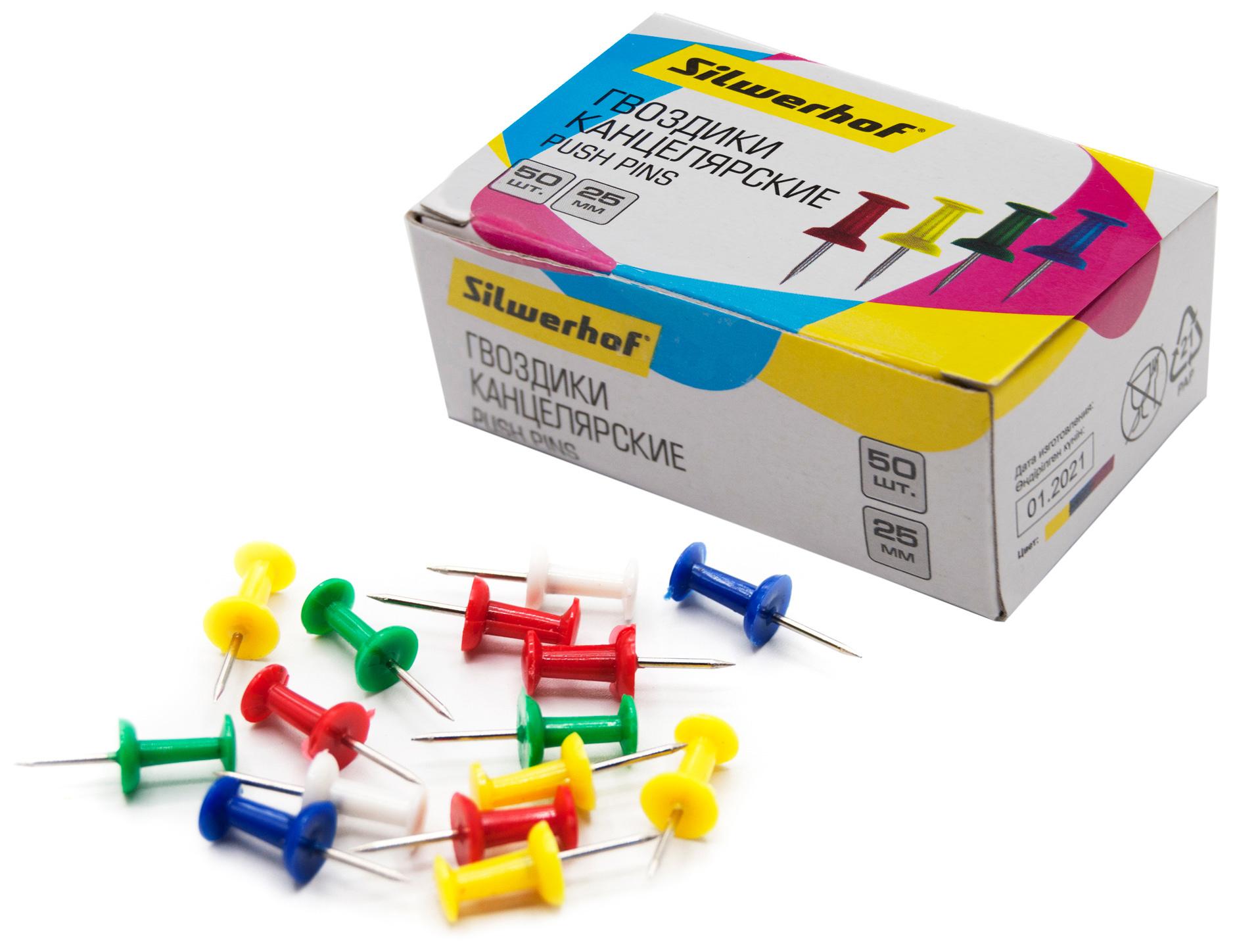 | | Кнопки канцелярские силовые 50шт 25мм SILWERHOF цветные (картонная упаковка)  Яркие силовые кнопки предназначены для крепления листов с информацией к различным поверхностям: пробковым и деревянным доскам, стенам. Разноцветные кнопки способны разбавить скучную офисную обстановку. Корпус: пластик, булавка: сталь. Тип кнопки: гвоздик. Тип острия: игольчатое. Упаковка: картонная коробка. Цвет: цветные |