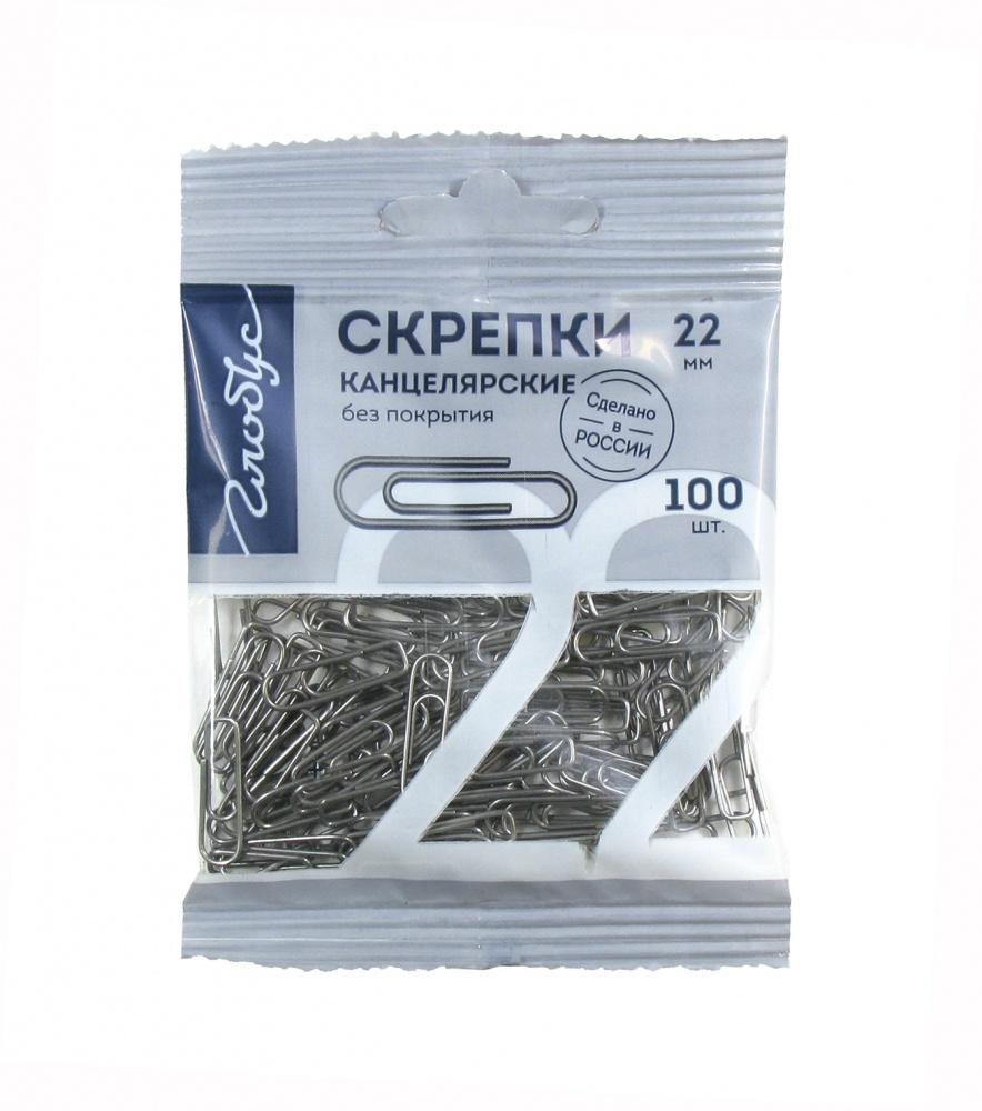 Скрепка канцелярская 22мм 100шт ГЛОБУС (п/упаковка с европодвесом)  Скрепки 22 мм 100 шт. в пакете с европодвесом. Флоу-пак. Металлические скрепки без покрытия надежно скрепляют документы, не повреждая бумагу. Скрепки имеют размер 22 мм. В пакете 100 скрепок. |