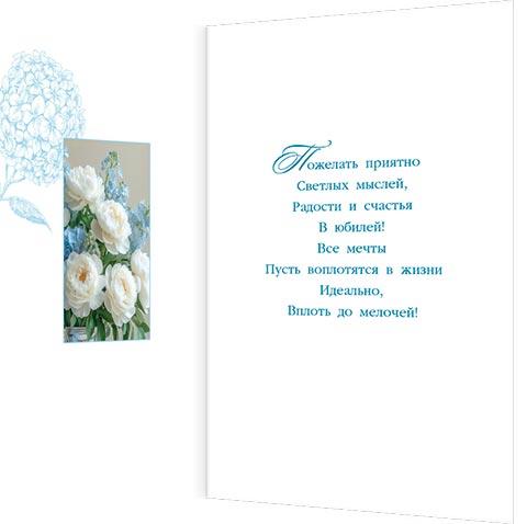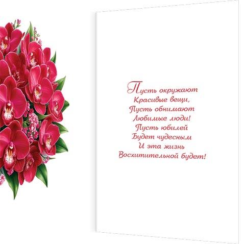 | | Открытка Поздравительная Юбилей А4 (МИР ОТКРЫТОК) 1-46-2595А С Юбилеем! (женская) (с блестками)  Сегодня день цветов и поздравлений! Пусть он подарит множество мгновений Чудесных, ярких, радостных, счастливых И прозвучит немало слов красивых, Чтоб стало на душе еще светлее. От всей души — с прекрасным юбилеем!