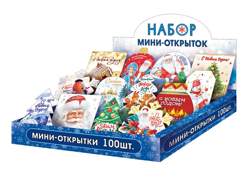 | Открытка НГ мини Комплект 100шт ФДА 900-34 С Новым Годом! (с блестками) (картонная упаковка)  Размер открытки от 10*7,5 см, 9*9 см, 11*5,5 см |