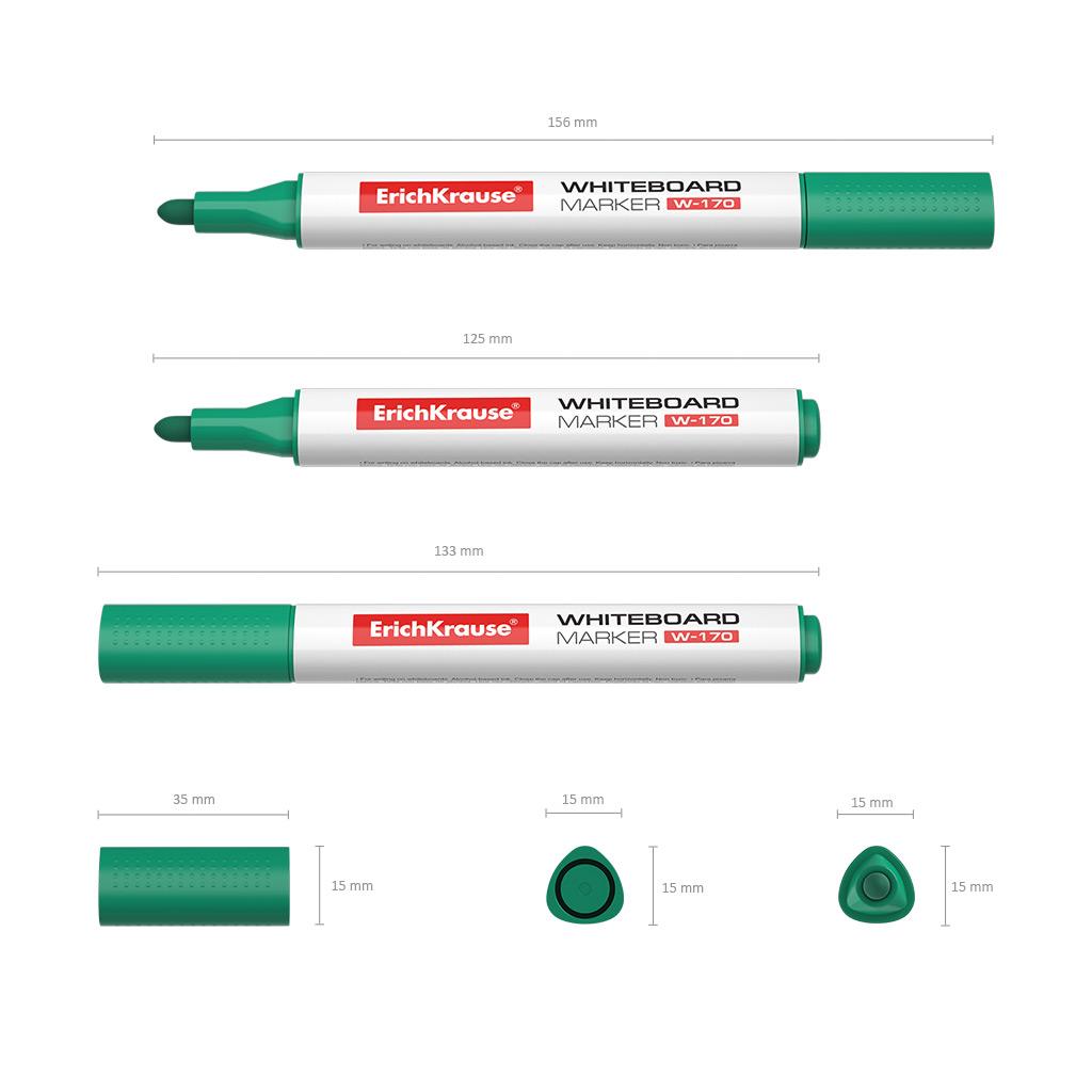 | Маркер для доски ErichKrause W-170 (пулевидный пищущий узел) 2мм (трехгранный корпус) зеленый  Маркер для письма и сухого стирания на досках. Незаменим во время проведения презентаций, совещаний и пр. Имеет эргономичную трехгранную форму корпуса, цветной колпачок, соответствующий цвету чернил. Наконечник пулевидной формы устойчив к повреждению и истиранию. Ширина письма - 2,0 мм. Чернила спиртовой основе, быстро высыхают после нанесения, надписи легко стираются сухой тканью, не оставляя следов. Нетоксичные. Не содержат ксилол, толуол. Хранить горизонтально. Срок годности 5 лет. Максимальтная длина непрерывной линии 700 м. |