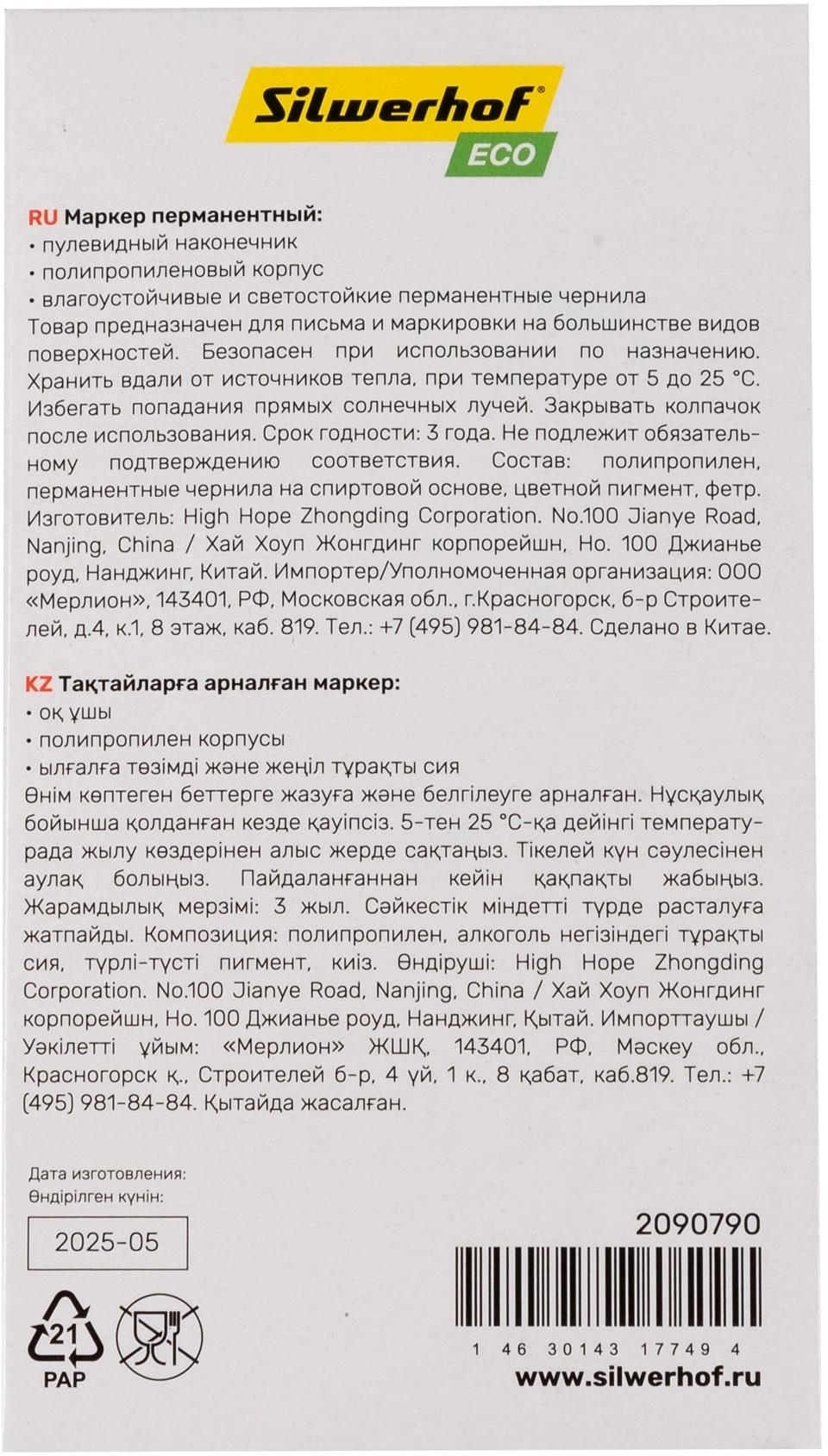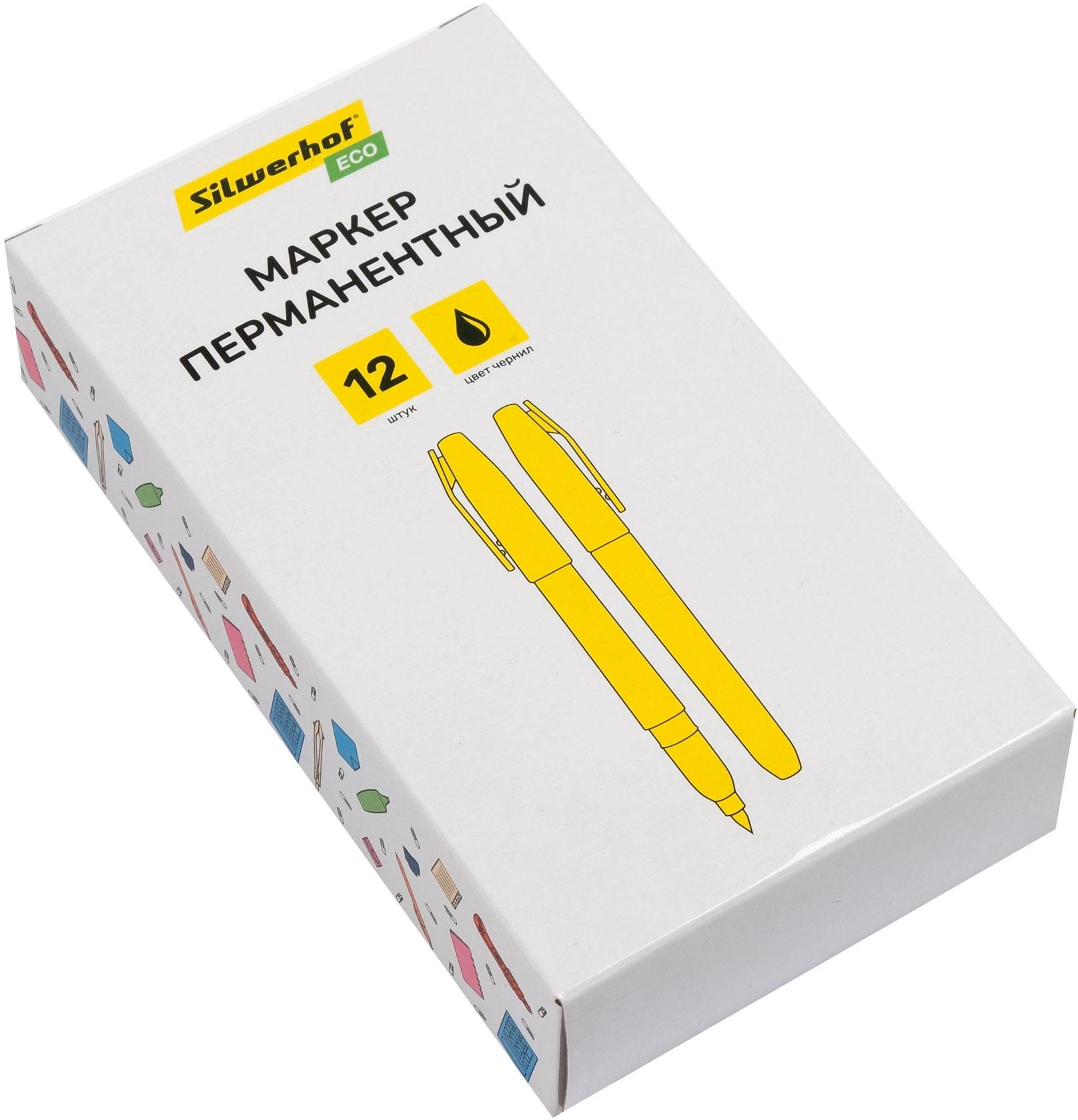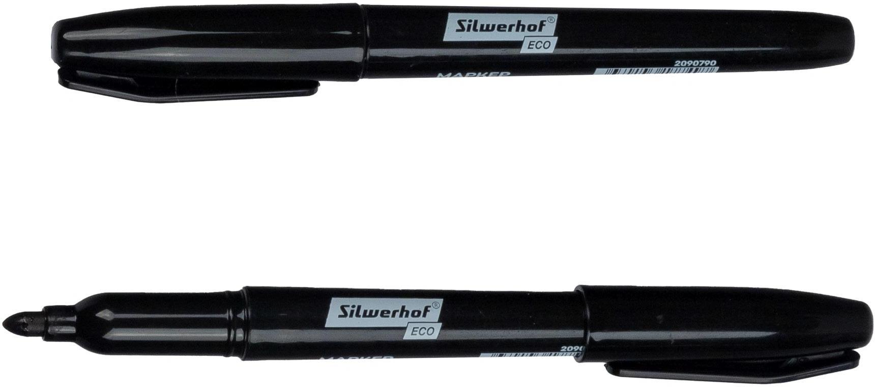 Маркер перманентный (пулевидный пишущий узел) SILWERHOF ECO 1мм черный  Перманентный маркер предназначен для письма на любой поверхности: бумага, полиэтилен, дерево, стекло, металл, натуральная кожа, ткань, камень, плитка. Чернила могут глубоко проникать сквозь бумагу, поэтому лучше всего рисовать или писать на картоне. Особая нестираемая основа перманентного маркера обеспечивает такие качества, как стойкость к воздействию воды, ультрафиолету, низким и высоким температурам. Благодаря спиртовой основе чернила быстро сохнут и не размазываются. Износостойкий наконечник устойчив к повреждениям и обеспечивает экономный расход чернил. Изделие не перезаправляется. Плотно закрывается колпачком, что предотвращает высыхание наконечника и чернил. Цвет колпачка соответствует цвету чернил. |