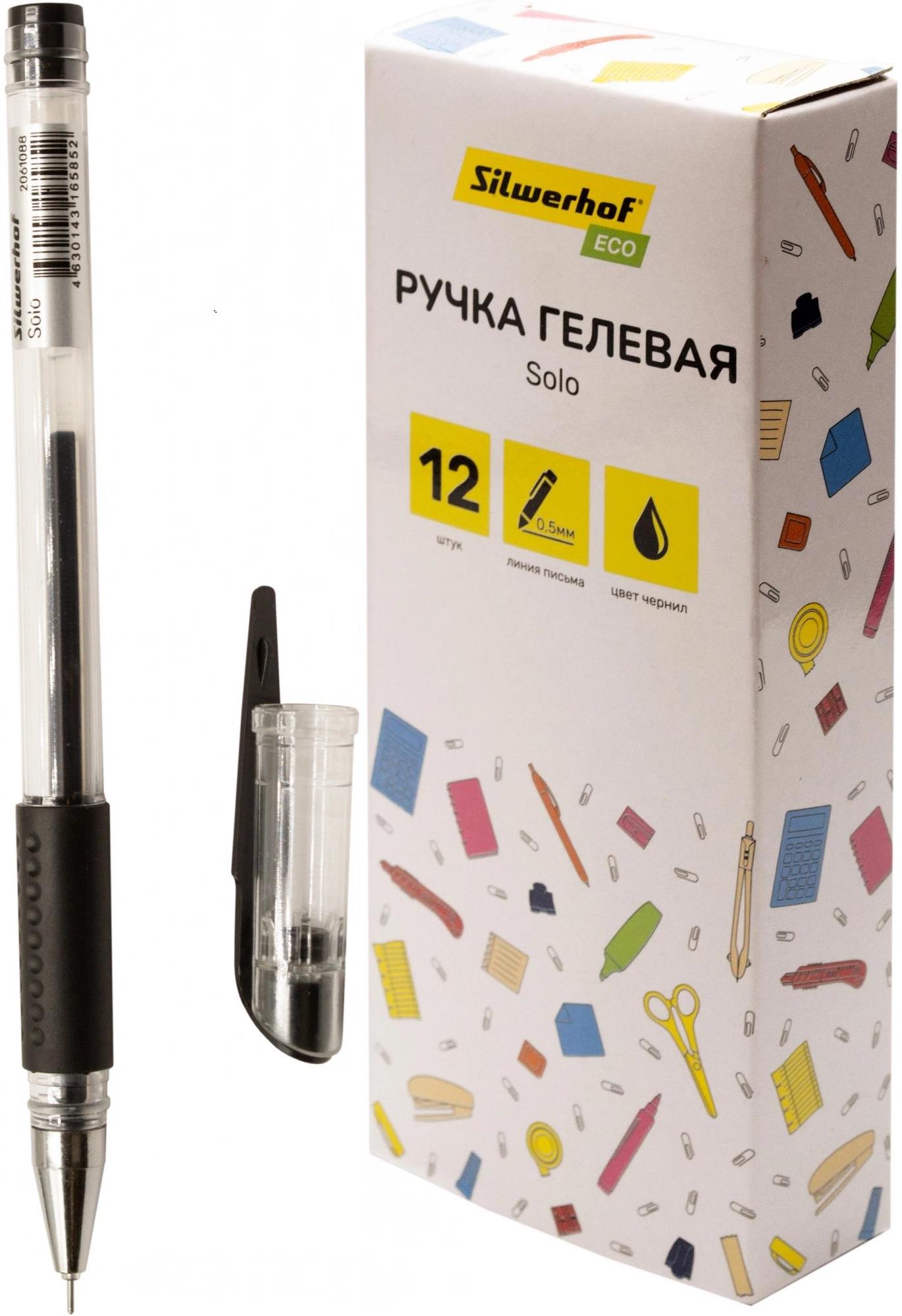 | Ручка гелевая SILWERHOF Eco Solo 0 5мм игла (грип-зона из резины) (прозрачный корпус) черная  Гелевая ручка - это надежная ручка, проверенная временем. В ней используются чернила, в которых пигмент суспензирован в геле на водной основе. Поскольку чернила густые и непрозрачные, они более отчетливо видны на гладких поверхностях, чем типичные чернила, используемые в шариковых ручках или фломастерах. Благодаря гелеобразной консистенции чернил и специальной технологии в пишущем узле гелевые ручки обеспечивают мягкое и комфортное письмо. Гелевая ручка может писать по любой поверхности и по любой бумаге. Ручка идеально подходит для экзаменов ЕГЭ, ведения документооборота, заполнения бланков, заметок в ежедневнике, заполнения личного дневника, рисунков в скетчбуке. |