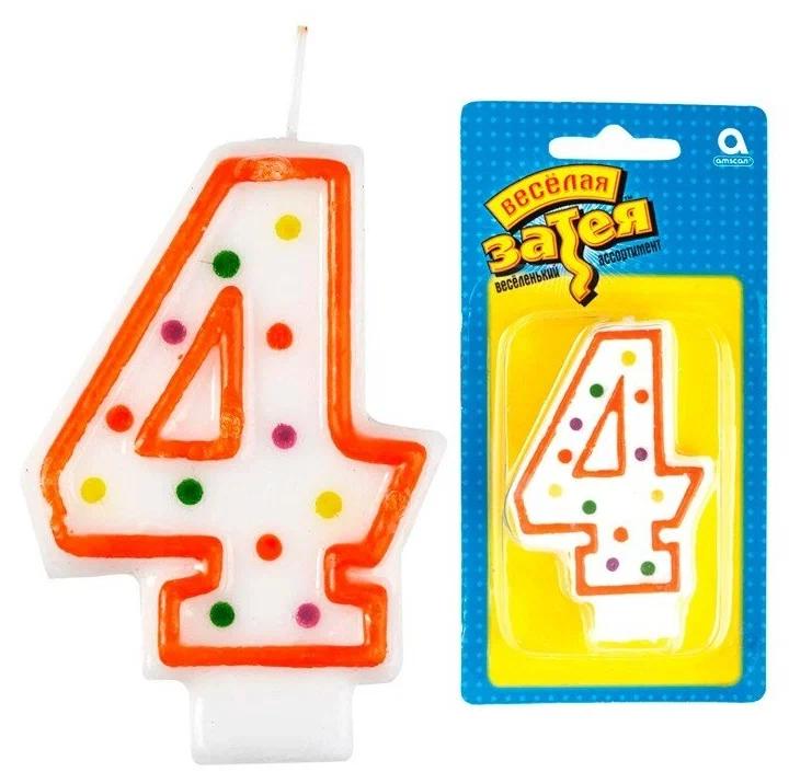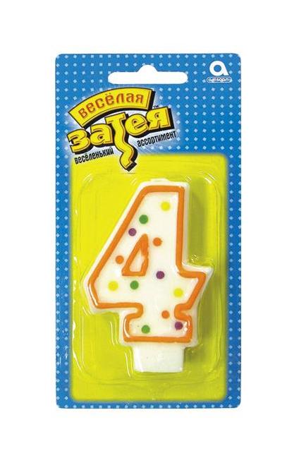 Свеча для торта ALINGAR Цифра "4" 7см белая горошек (картонная упаковка с европодвесом)  Свеча для торта с держателем Alingar, 7,0 см, "Цифра 4", белый цвет, горошек, цветная окантовка, блистер с европодвесом. |