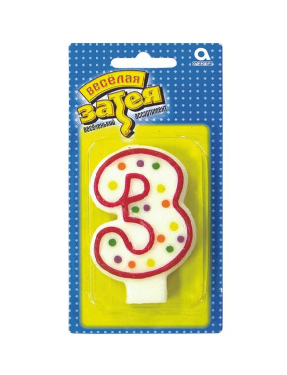 | Свеча для торта (Веселая Затея) Цифра "3" 7, 6см (картонная упаковка с европодвесом) 1502-0141  Декоративное украшение стола. Свеча в форме цифры. Яркий, модный дизайн - Горошек. РИСУНОК С ДВУХ СТОРОН свечи! Отличное решение для декорирования торта, десерта ко дню рождения или юбилею. Стеарин, оригинальный дизайн. Высота свечи-цифры 7,6см. |