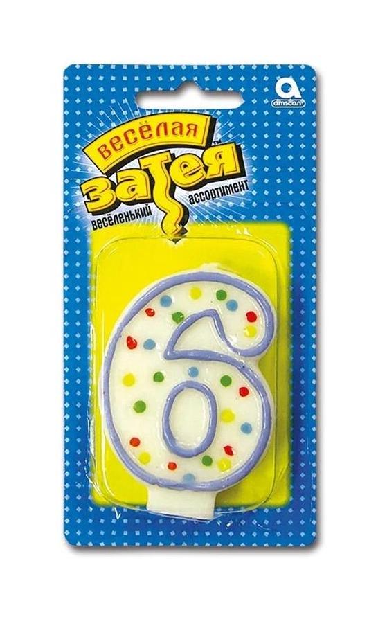 | | Свеча для торта (Веселая Затея) Цифра "6" 7, 6см (картонная упаковка с европодвесом)  Декоративное украшение стола. Свеча в форме цифры "6". Яркий, модный дизайн - Горошек. РИСУНОК С ДВУХ СТОРОН свечи! Отличное решение для декорирования торта, десерта ко дню рождения или юбилею. Стеарин, оригинальный дизайн. Высота свечи-цифры 7,6см. |