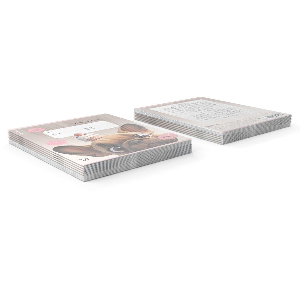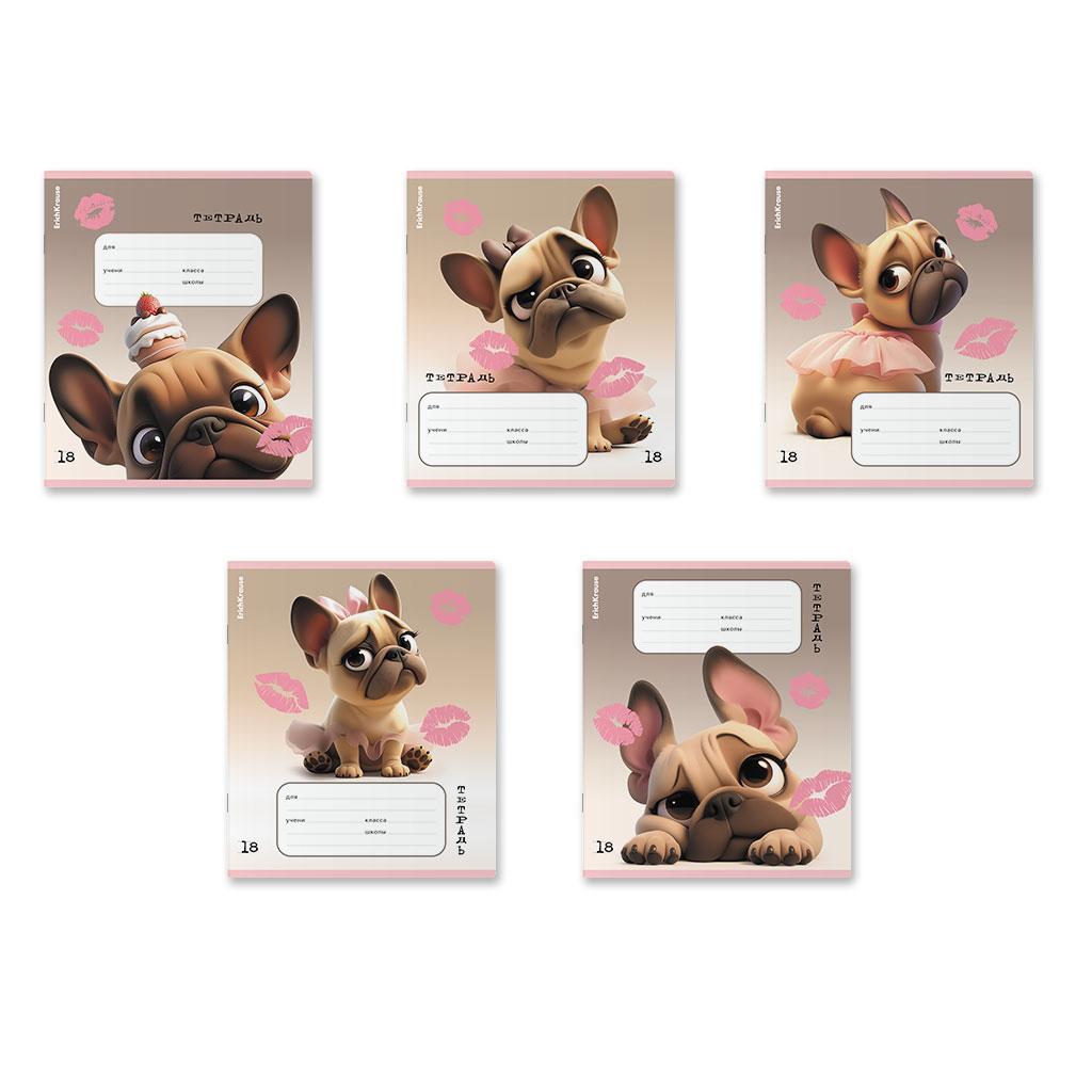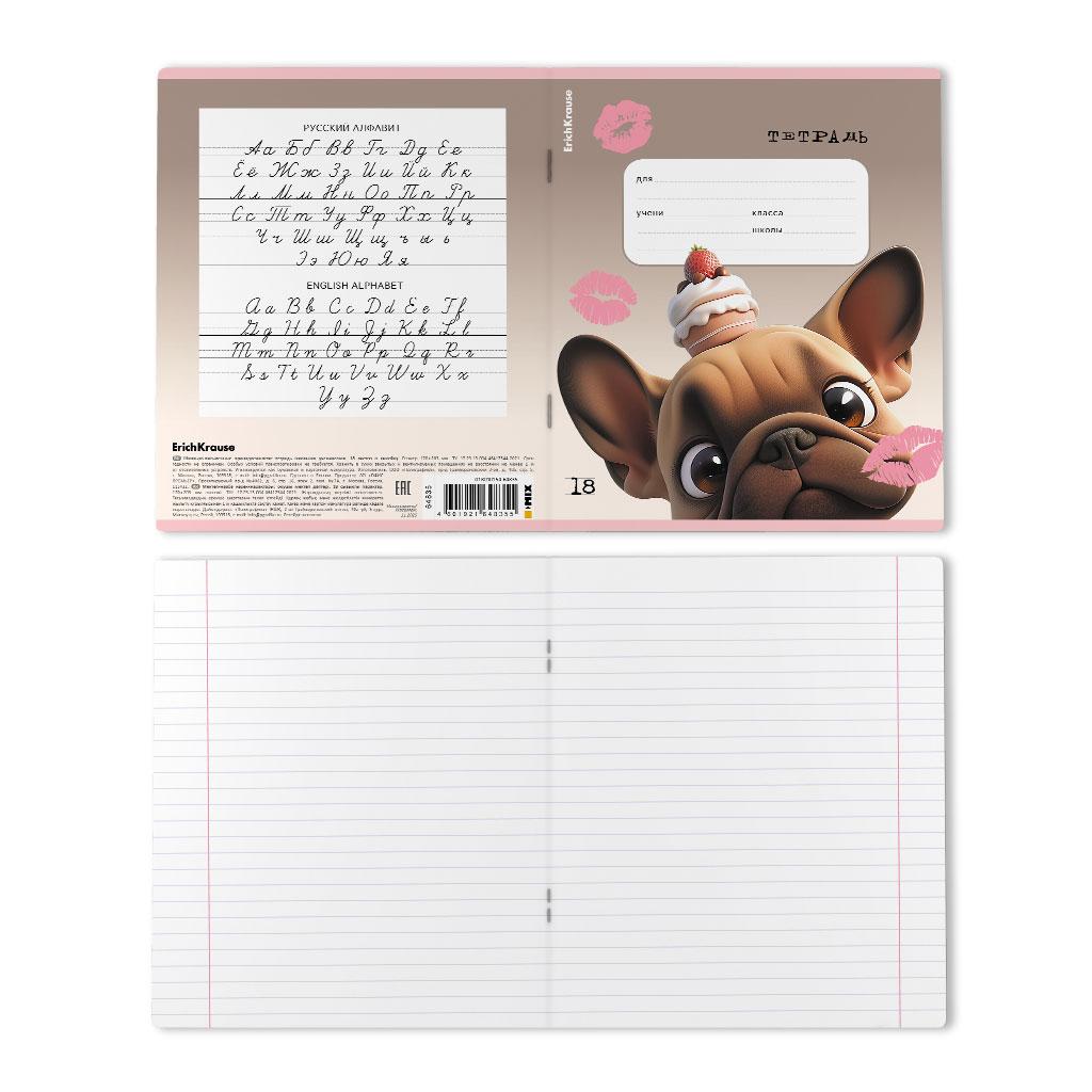 | | Тетрадь 18 листов А5 на скрепке (линейка) ErichKrause офсет (выборочный лак) Frenchie Mix-pack Ассорти  Тетрадь школьная ученическая формата А5+ (170х203 мм). Обложка из высококачественного мелованного картона плотностью 170 г/м2. Отделка обложки - выборочный УФ-лак. В блоке 18 листов в линейку с полями. Бумага офсетная плотностью 60 г/м2. Цвет линовки - синий. Скругленные уголки обложки и блока. Тип скрепления - скоба. Тетради разного дизайна упакованы в термоусадочную пленку по 10 штук.