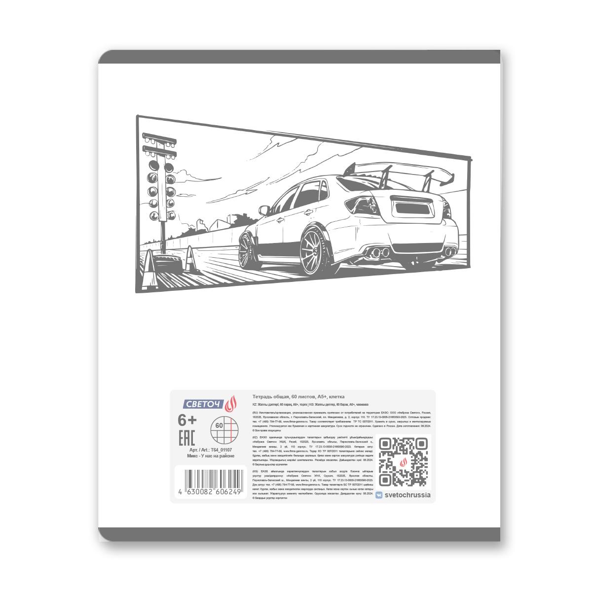 Тетрадь общая А5 на скрепке 60 листов (клетка) SVETOCH офсет (картонная обложка) У нас на районе Ассорти  Тетрадь общая А5 формата, 60 листов, предназначена для учащихся средних и старших классов, учащихся вузов, а так же прекрасно подойдет для дома и офиса. Двойная обложка: внешняя выполнена из высококачественного износостойкого прозрачного пластика толщиной 180 мкм, внутренняя — из мелованной бумаги с чёрно-белым дизайном. Вместе создают единый оригинальный дизайн тетради. Внутренний блок - офсетная бумага плотностью 65 г/кв. м, 100% белизны. Линовка - клетка, красные поля. Вид скрепления - скоба. Тетради упакованы в термоусадочную пленку по 10 штук (ассорти). В коробе находится 4 упаковок, 40 шт. Внимание! В оптовой упаковке возможен повтор дизайна. |