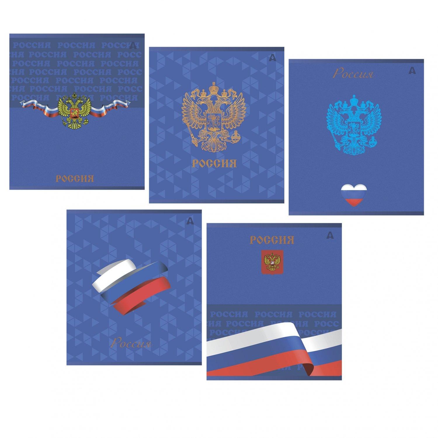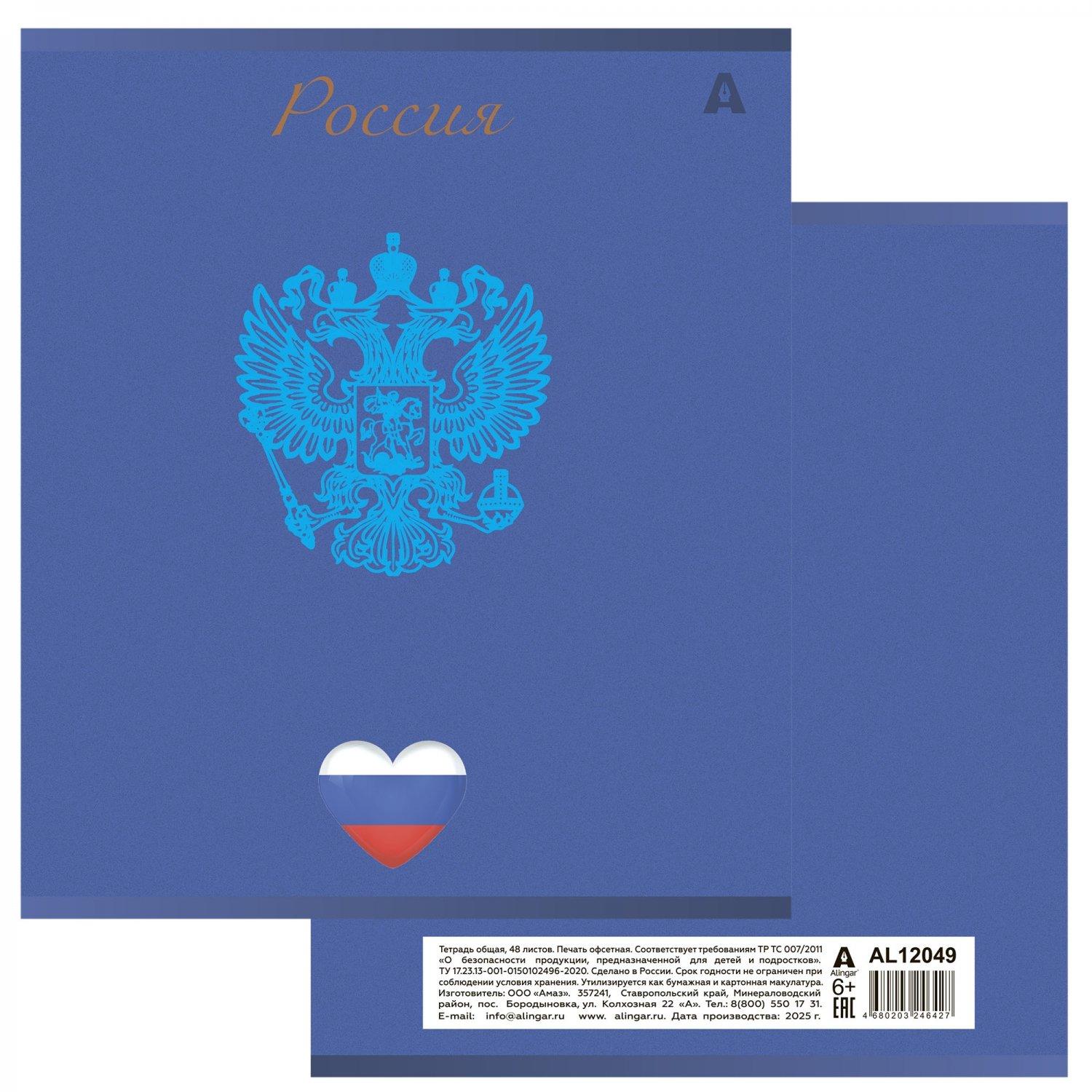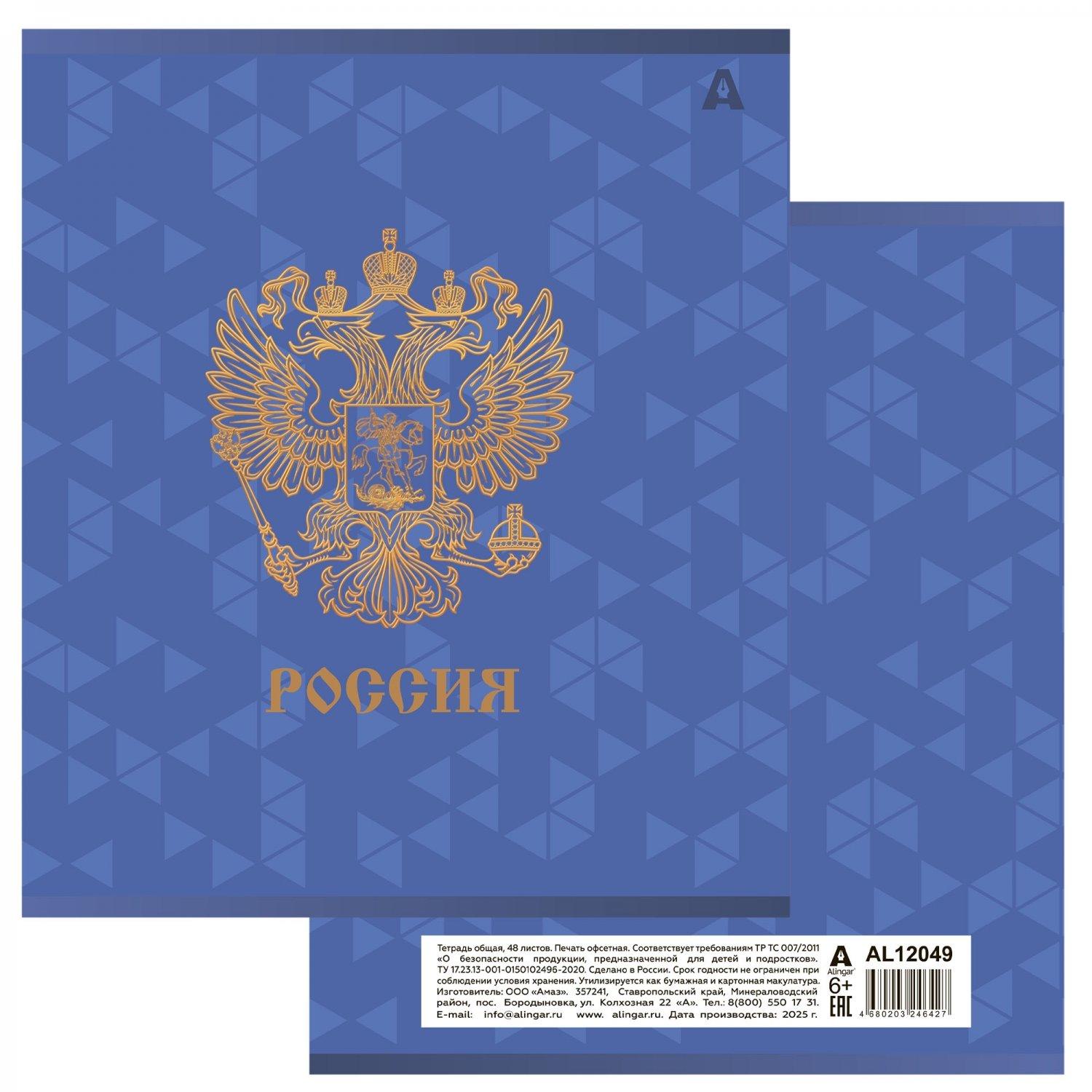 Тетрадь общая А5 на скрепке 48 листов (клетка) ALINGAR офсет (выборочный лак) Символика России MIX Ассорти  Тетрадь 48л, А5, клетка, Alingar, "Символика России", скрепка,мелованный картон (стандарт), выб УФ лак, блок офсет, 5 дизайнов в пленке т/у |