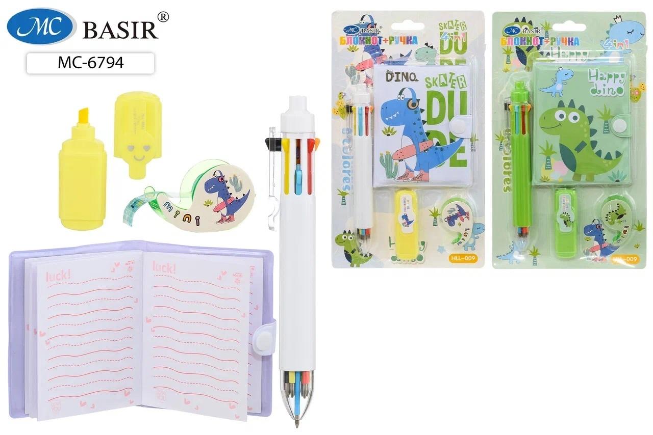 | | Подарочный набор BASIR Dino (блокн +руч авт +текст-марк +дисп +скотч)к/б АссортиМарка/Производитель: BASIR  Набор подарочный канцелярский: детский "DINO"; блокнот на кнопке /10,3*7 см/+8-ми цветная авторучка+мини текстмаркер+диспенсер с детским скотчем, яркая упаковка-блистер на подложке с европодвесом /22*13 см/. |