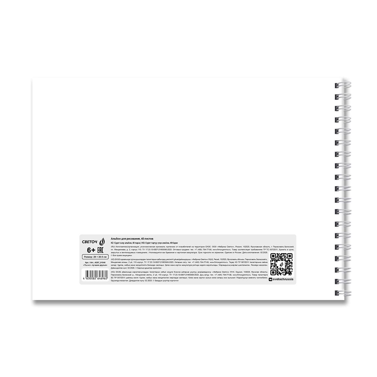 | Альбом для рисования А4 на гребне 40 листов (картонная обложка, твердая подложка) SVETOCH (пластиковая обложка) Ты и я-лучш друз (плотность бумаги 100 г/кв м) Ассорти  Альбом 40 листов подходит для рисования карандашами, фломастерами, красками. Рисование в альбомах - это увлекательный и творческий досуг для всех. Двойная обложка: внешняя выполнена из высококачественного износостойкого прозрачного пластика толщиной 180 мкм, внутренняя — из мелованной бумаги с цветным дизайном. Вместе создают единый оригинальный дизайн тетради. Внутренний блок - офсетная бумага плотностью 100 г/кв. м, 100% белизны. Вид скрепления - гребень. Альбомы упакованы в термоусадочную пленку по 5 штук (ассорти). В коробе находится 6 упаковок, 30 штук. |