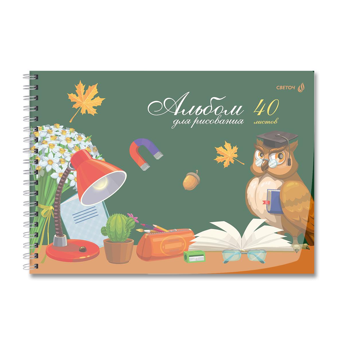 | | Альбом для рисования А4 на гребне 40 листов ALINGAR (картонная обложка) Сова (плотность бумаги 100 г/кв м)  Альбом для рисования А4, 40л, Alingar, гребень, целлюлозный картон 210г/м2, офсет 100 г/м2,, "Сова", 1 дизайн в пленке т/у |