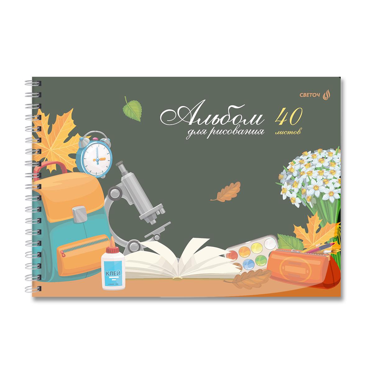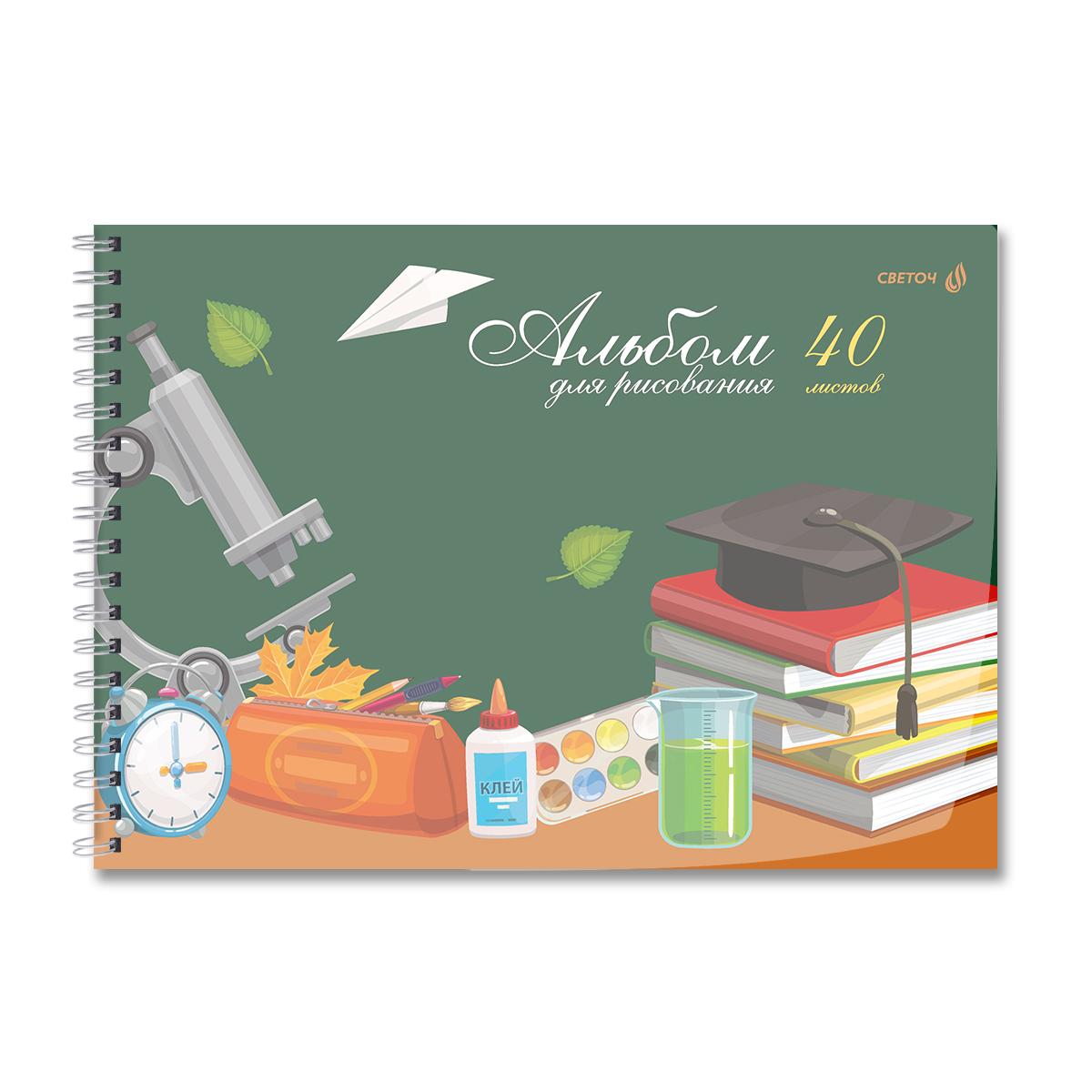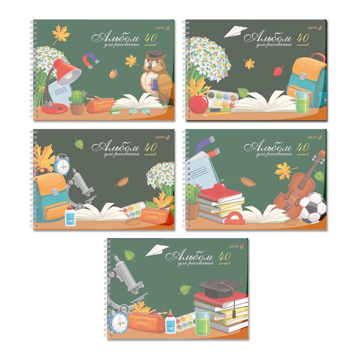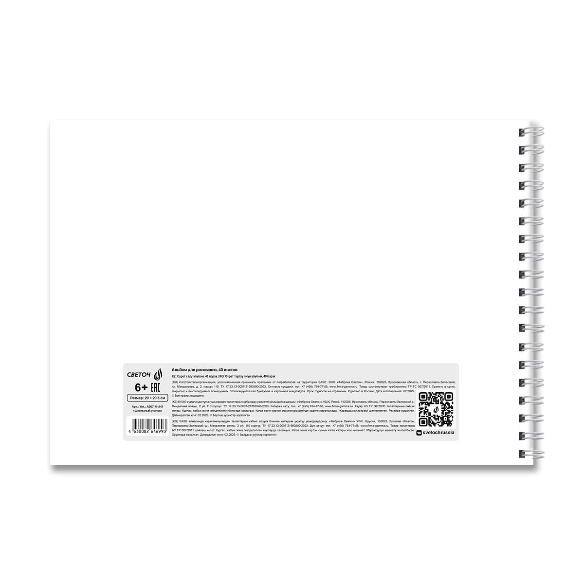 | | Альбом для рисования А4 на гребне 40 листов (картонная обложка, твердая подложка) SVETOCH (пластиковая обложка) Школьный уголок (плотность бумаги 100 г/кв м) Ассорти  Альбом 40 листов подходит для рисования карандашами, фломастерами, красками. Рисование в альбомах - это увлекательный и творческий досуг для всех. Двойная обложка: внешняя выполнена из высококачественного износостойкого прозрачного пластика толщиной 180 мкм, внутренняя — из мелованной бумаги с цветным дизайном. Вместе создают единый оригинальный дизайн тетради. Внутренний блок - офсетная бумага плотностью 100 г/кв. м, 100% белизны. Вид скрепления - гребень. Альбомы упакованы в термоусадочную пленку по 5 штук (ассорти). В коробе находится 6 упаковок, 30 штук. |