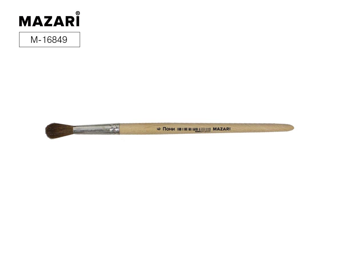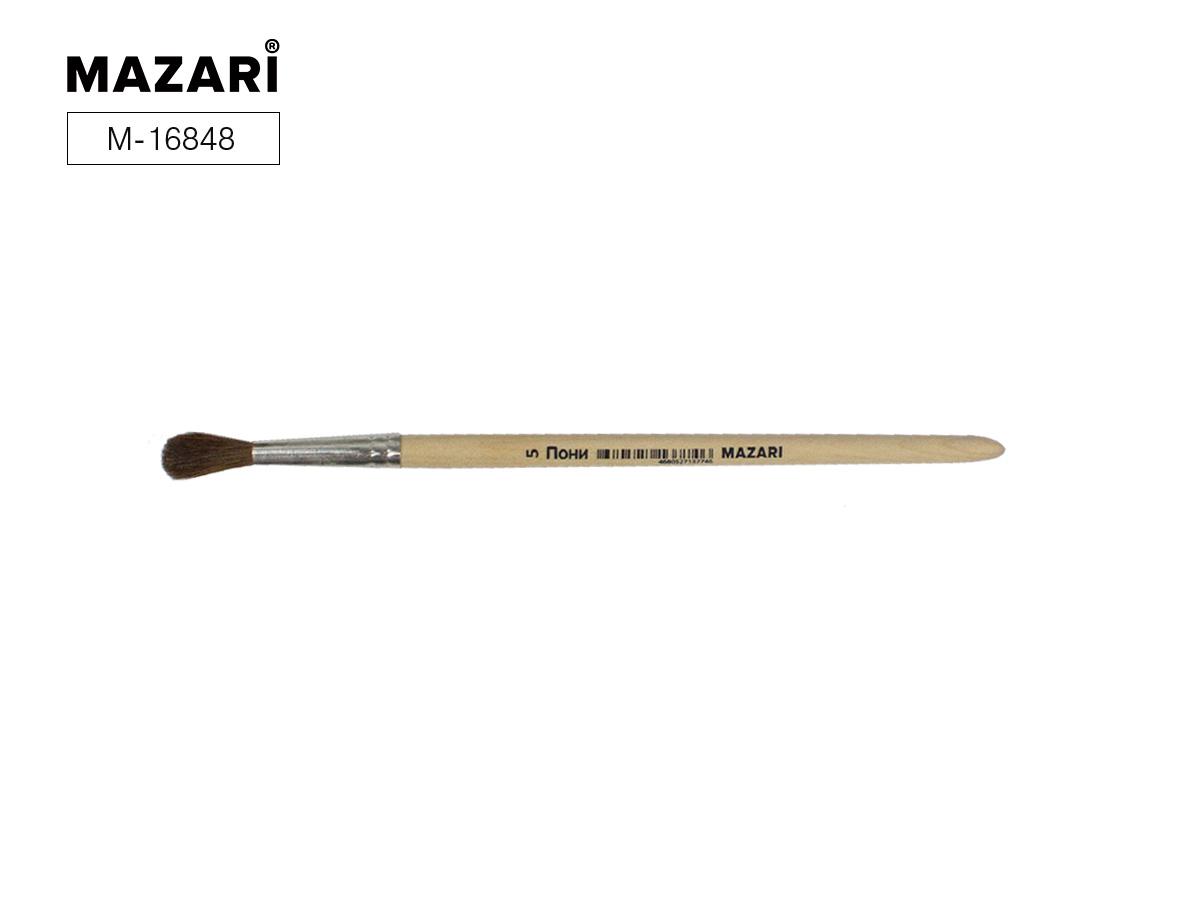 | Кисть пони N- 5 художественная круглая MAZARI M-16848  Художественная кисть изготовлены из волоса пони. Волос пони несколько толще, чем у белки, расстояние между волосками больше, поэтому воду такая кисточка набирает меньше, чем из белки или колонка. Не слишком упруги. Кисть круглой формы идеальна для начинающих художников, поэтому её часто используют в детских образовательных учреждениях. |