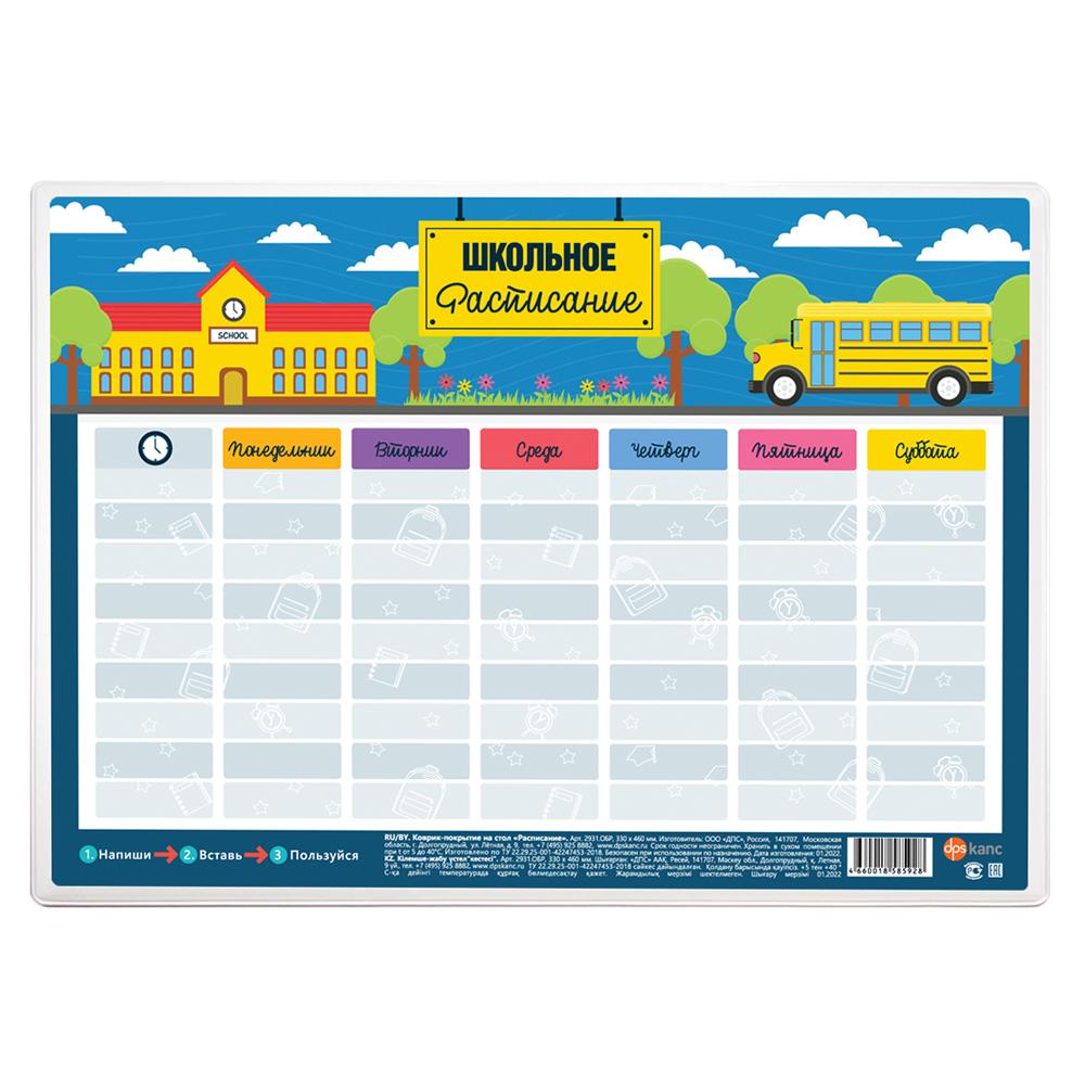 | Покрытие на стол ДПС 33*46см Расписание (п/упаковка)  Настольное покрытие для творчества предназначено для защиты поверхности рабочего стола от загрязнений и повреждений, сбережёт рабочую поверхность от разного рода повреждений и царапин. Настольное покрытие предназначено для рисования, лепки и различных творческих работ как в школе, так и дома. Это незаменимый помощник в творческих работах как для дошкольника, так и для школьника. Предусмотрен для многоразового использования. |