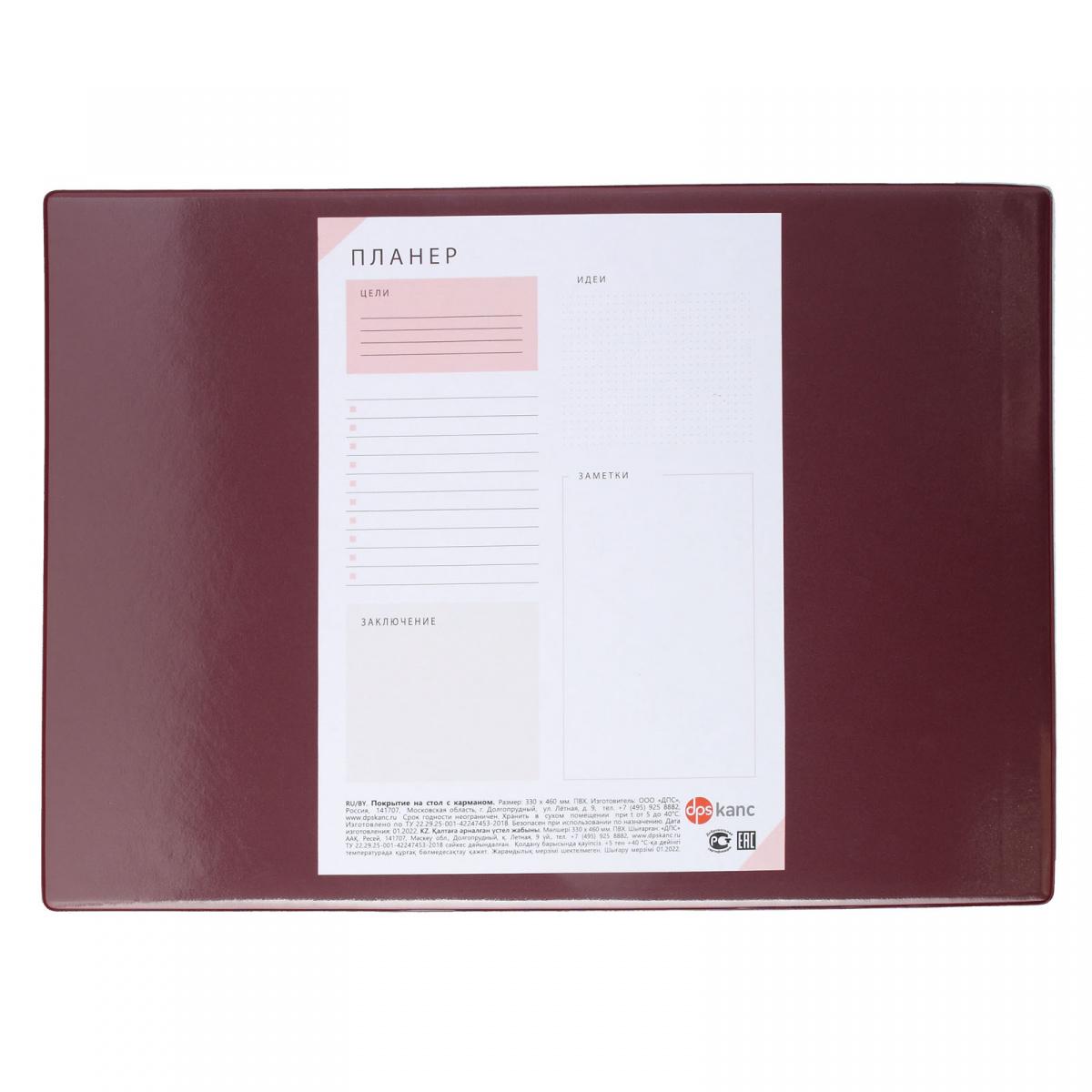 | | Покрытие на стол ДПС 33*46см с карманом бордо (п/упаковка)  Незаменимая вещь для конференций и других бизнес встреч. Планер легко вытащить и внести записи или поменять на другой лист. Обеспечит удобство во время письма. Нескользящая основа. Внутри картон. - Размер - 330 х 460 мм - Материал - ПВХ |