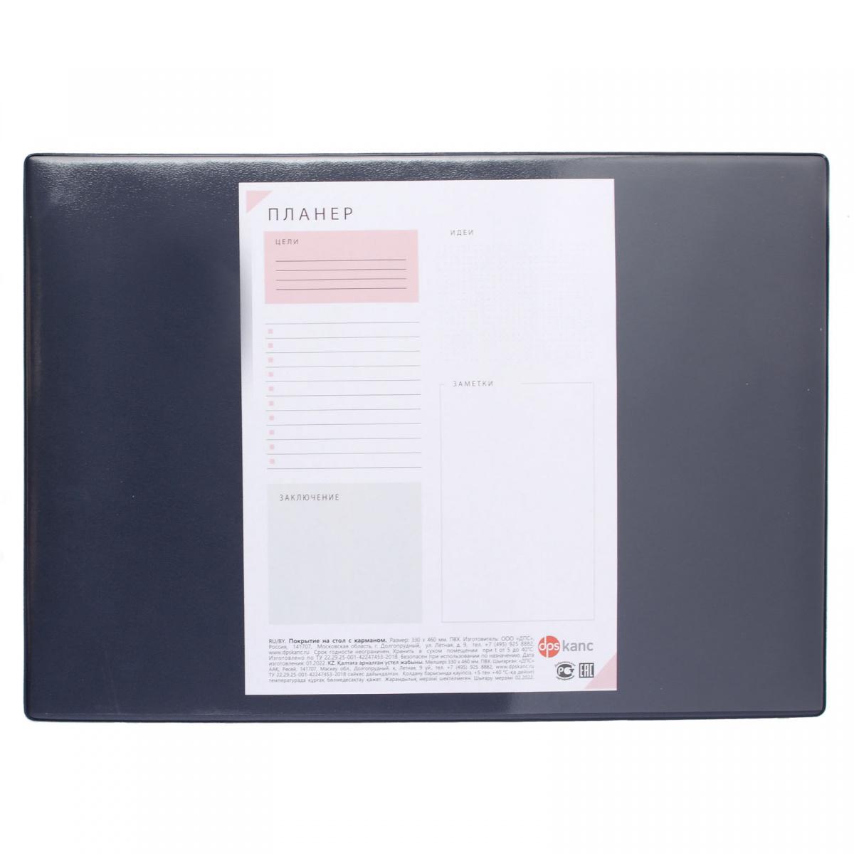 | Покрытие на стол ДПС 33*46см с карманом т -синее (п/упаковка)  Незаменимая вещь для конференций и других бизнес встреч. Планер легко вытащить и внести записи или поменять на другой лист. Обеспечит удобство во время письма. Нескользящая основа. Внутри картон. - Размер - 330 х 460 мм - Материал - ПВХ |