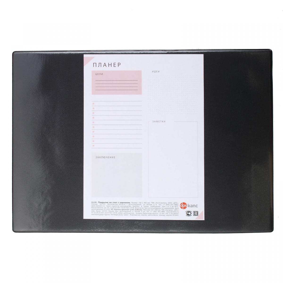 | | Покрытие на стол ДПС 33*46см с карманом черное (п/упаковка)  Незаменимая вещь для конференций и других бизнес встреч. Планер легко вытащить и внести записи или поменять на другой лист. Обеспечит удобство во время письма. Нескользящая основа. Внутри картон. - Размер - 330 х 460 мм - Материал - ПВХ |