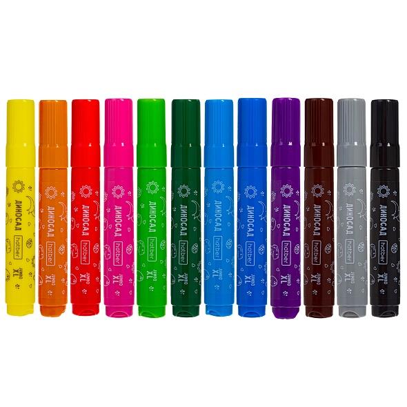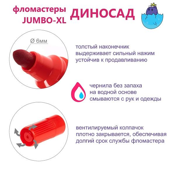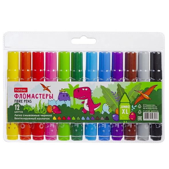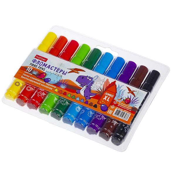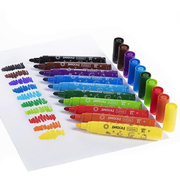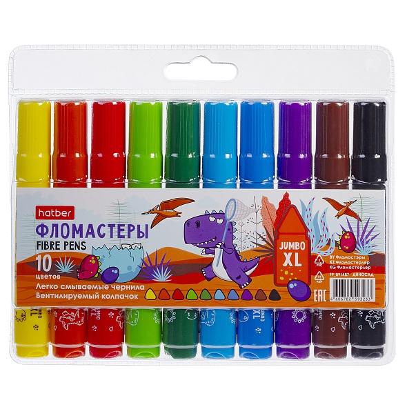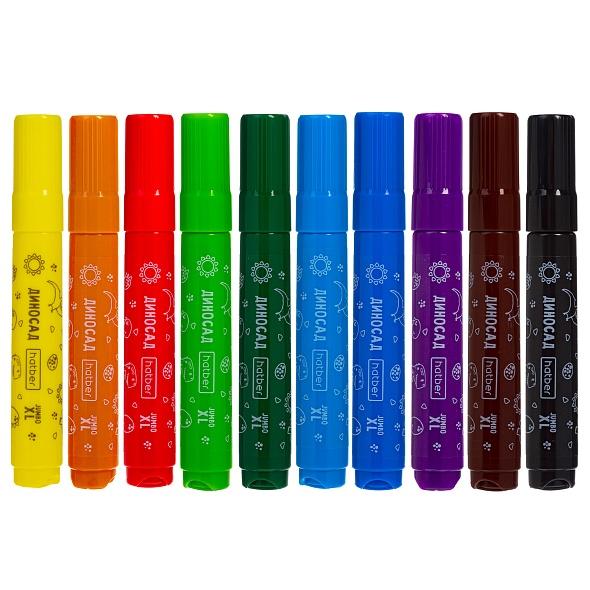 Фломастеры утолщённые Набор 10 цветов (ХАТБЕР) Jumbo-XL Диносад смываемые (вентилируемый колпачок) (п/упаковка с европодвесом)  Фломастеры Hatber JUMBO-XL ДИНОСАД 10 цветов с одним из самых толстых корпусов в своём классе - диаметром 19мм.Утолщённая форма корпуса, позволяет ребёнку удобно держать фломастер в руке. Корпус из полипропилена устойчив к разлому, - безопасен при попытке сломать. Чернила фломастеры изготовлены на водной основе, не имеет запаха, безопасны, легко смываются с рук и одежды с помощью воды и мыла. Штрихи и линии не проступают на обратную сторону листа. Толстый наконечник, диаметром 6мм, выдерживает сильный нажим и не проваливается внутрь корпуса.Колпачок имеет специальные прорези для вентиляции, которые способствуют прохождению воздуха при случайном попадании в дыхательные пути ребёнка. При этом колпачок плотно закрывается, обеспечивая долгий срок службы фломастера. |