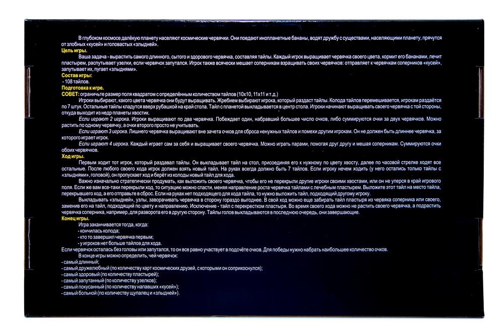 | | Игра настольная РАКЕТА "Космические червячки" (картонная упаковка)  Игроки по очереди вытаскивают тайлы и пытаются составить из них червяка, который обитает в космосе. У каждого игрока свой червячок и у каждого свой цвет. Они их кормят, лечат пластырем, мешают соперникам растить других червячков-соперников. Задача вырастить самого большого. Это семейная веселая игра будет интересна всегда и станет для нескольких поколений забавным вечерним развлечением. Именно поколений, т.к тайлы, которые нужно складывать, выполнены из дерева и они будут служить бесконечно долго. Подарочная коробка 37Х26Х5 см. Фишки 45Х45 мм из мдф(дерево). Возраст 5-99 лет. |
