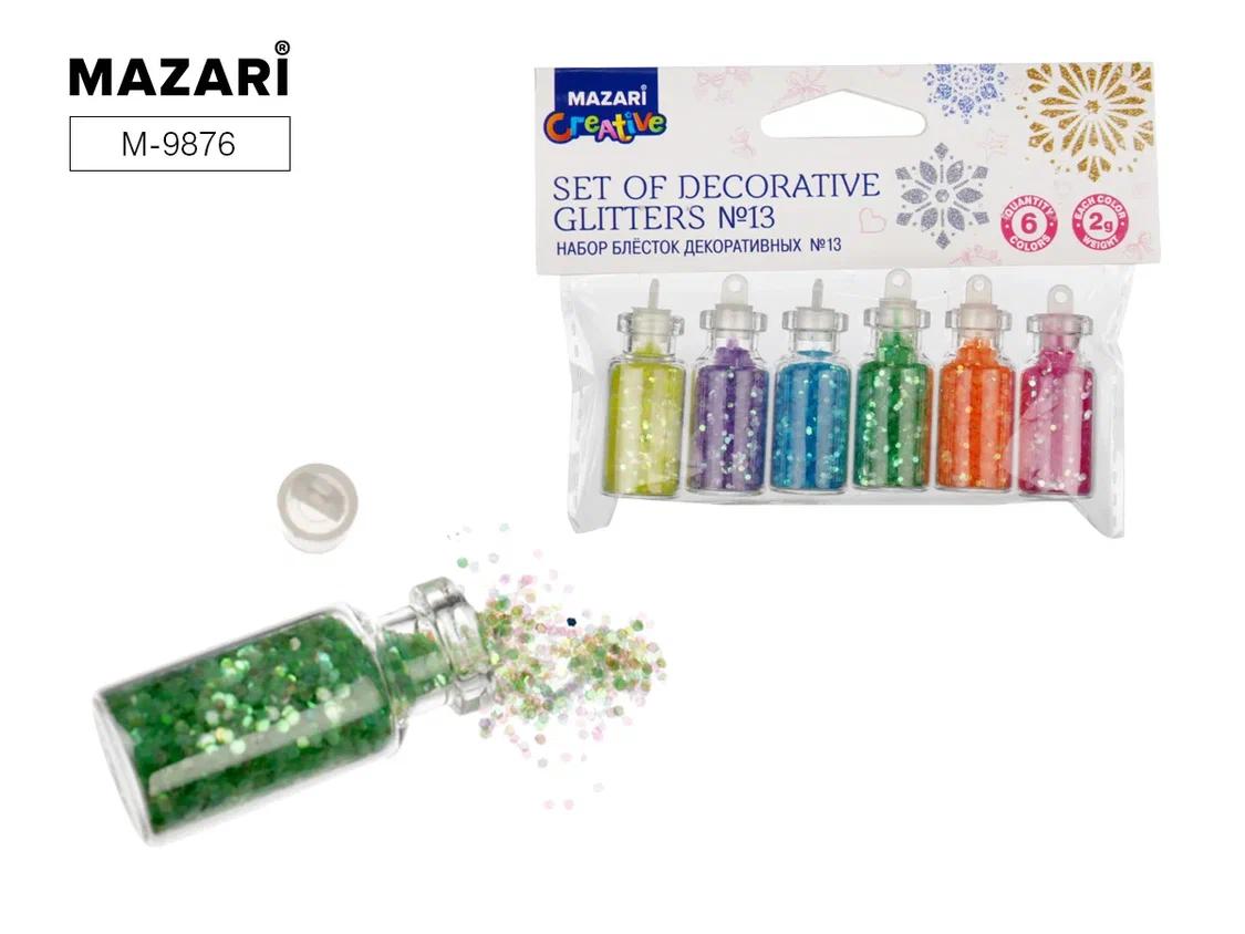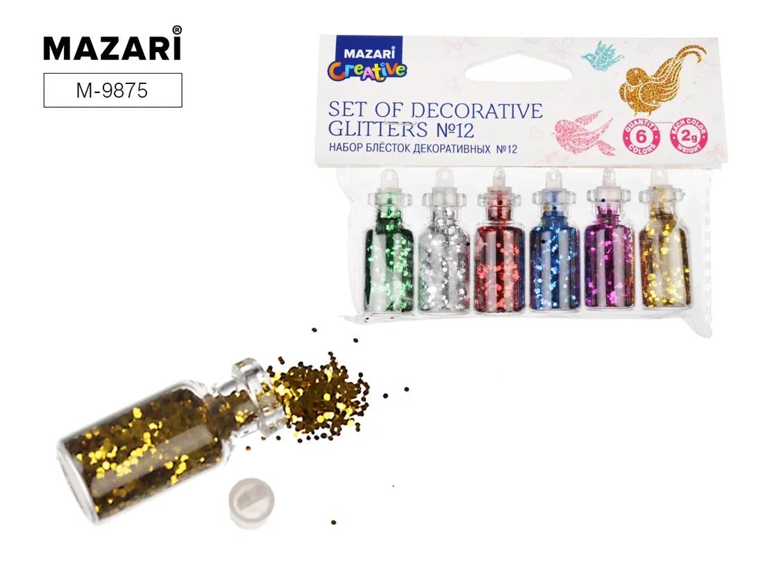 | Материалы для творчества Декоративные Блестки MAZARI набор #12 6 цветов * 2г (в стеклянной колбе) (п/упаковка с европодвесом)  Декорирование с помощью блесток - это простой и эффективный метод по созданию уникального продукта. Для украшения изделий из дерева, стекла, картона, бумаги, воска и других материалов. Используются самостоятельно и в сочетании с красками, лаками, структурными пастами и гелями. |